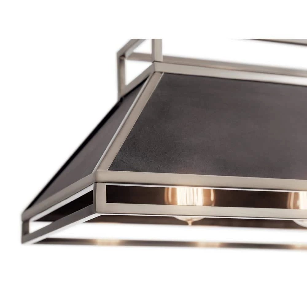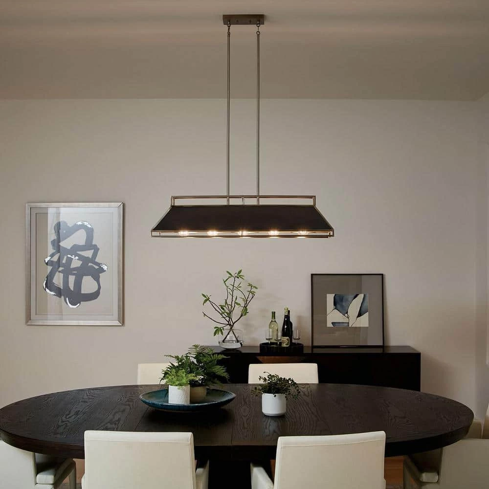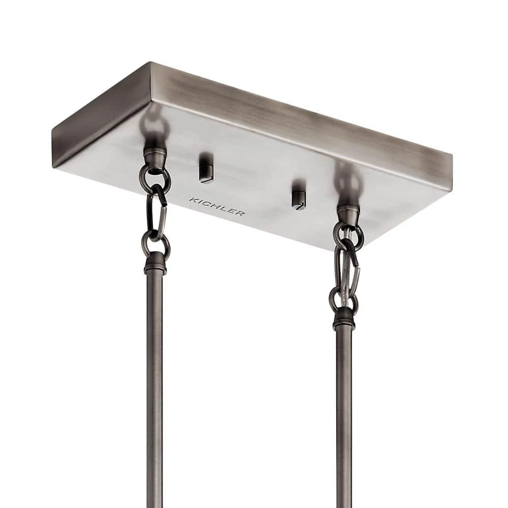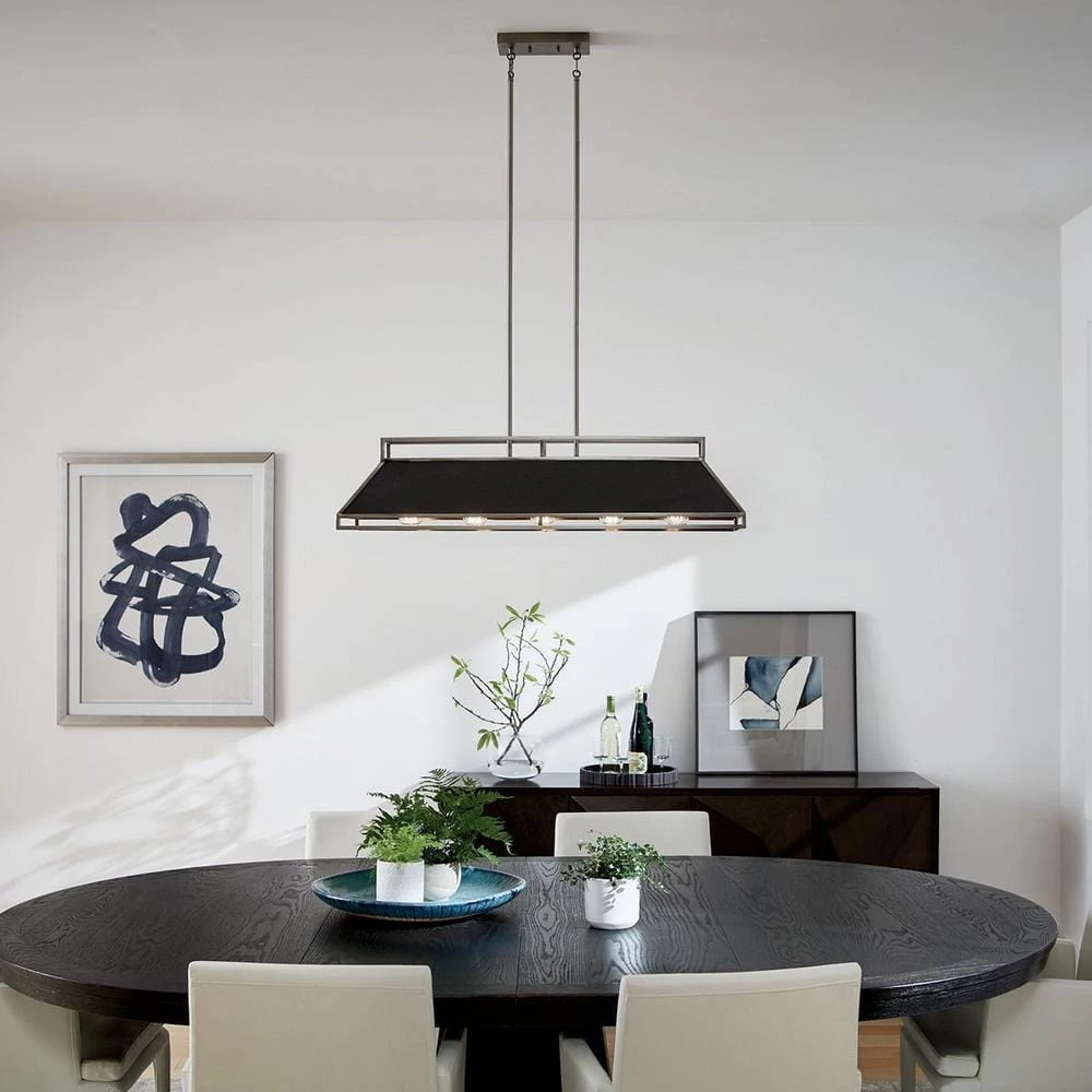The Kichler Grendel 5-Light Classic Pewter Linear Chandelier features a kitchen-vent inspired design. It holds five incandescent bulbs to provide optimal illumination. The open metal framework helps direct strong light downward and soft, ambient light towards the ceiling. With a classic pewter frame finish, this chandelier adds industrial-style elegance to your decor.