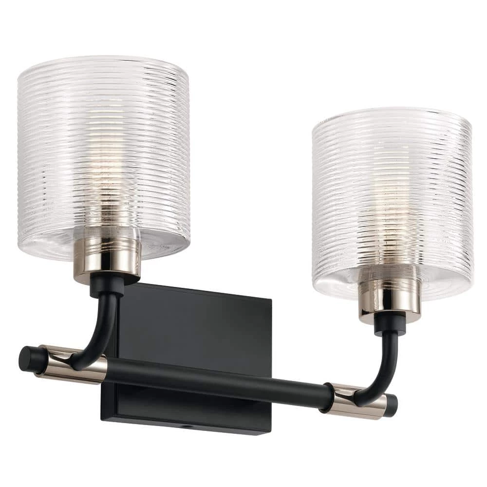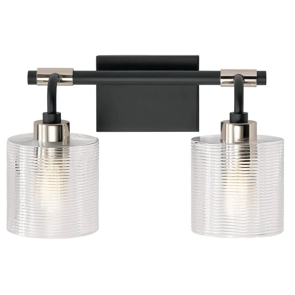 The Harvan collection was designed for those with an edge. Inspired by the cleaned-up industrial trend, this collection features polished metals mixed with utilitarian motifs and hardware. The curved glass shades feature a ribbing that makes you look twice. Harvan is edgy. And it’s refined. The Harvan 15 in. 2-light vanity light declares your refined industrial style. It’s Black finish stands out from the crowd and its Polished Nickel accents add a dash of charisma. Not to be left out, the clear glass shade is ribbed, giving it added dimension. This light will make guests head to your bathroom just to check it out.