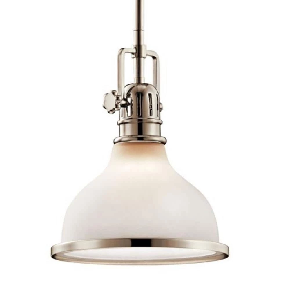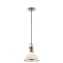 The Kichler Hatteras Bay 10.25 in. 1-Light Polished Nickel Mini Pendant makes a subtle statement in any space. It features a white glass bowl with an inside etched clear Fresnel lens for an enhanced visual appeal. With its polished nickel finish, this mini pendant light blends exceptionally well with a variety of decor styles.