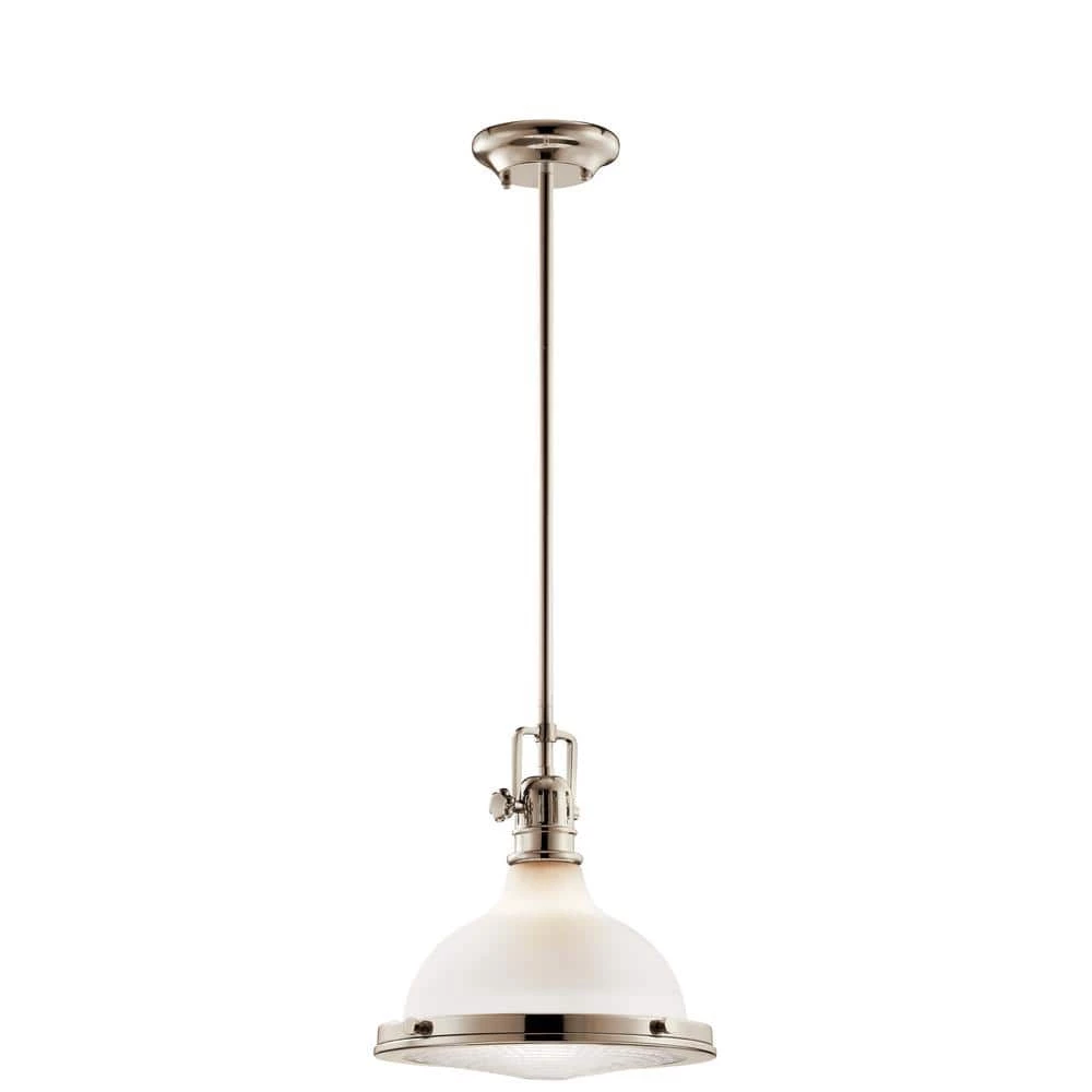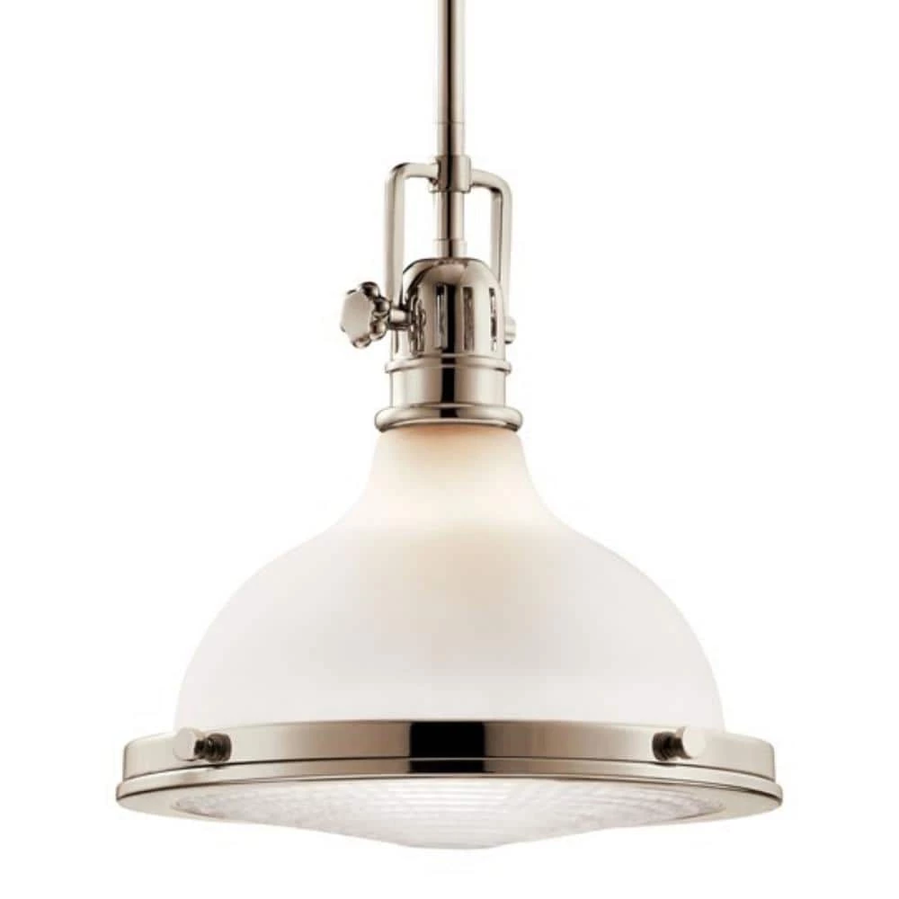 The KICHLER Hatteras Bay 12 in. 1-Light Polished Nickel Pendant Light gives your room a stylish upgrade. It features satin etched white glass bowl with an inside etched clear Fresnel lens to efficiently illuminate your living space. With its polished nickel finish, this pendant light blends exceptionally well with a variety of decor styles.