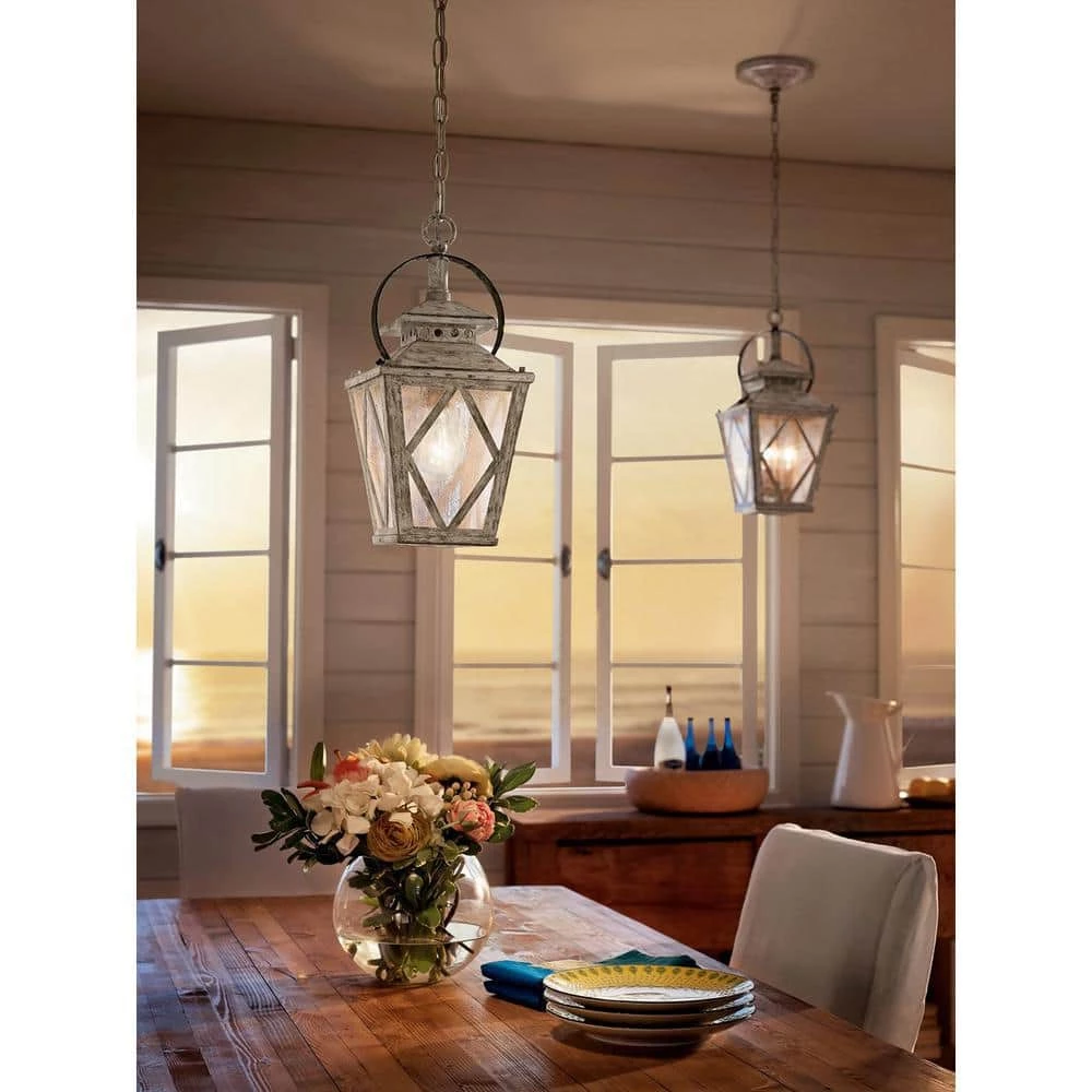 The KICHLER Hayman Bay 18 in. 2-Light Distressed Antique White Pendant Light adds a radiant charm to your home decor. It features a clear seeded glass diffuser that offers ambient lighting to your space. Its distressed wood-style detail blends exceptionally well with traditional, industrial and rustic decor styles, among others.
