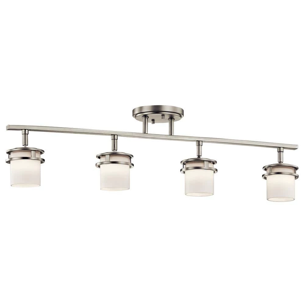 Upgrade your decor with the KICHLER Hendrik 30 in. 4-Light Brushed Nickel Rail Light. Each shade is made of satin etched cased opal glass to cast a warm and relaxing glow when illuminated. The lights can be adjusted to various angles to suit your needs, such as, highlighting an art-piece, casting a glow on your walls and mirrors, and so on. Made of premium quality steel, this rail light ensures years of reliable use. It features a water-resistant finish and galvanized undercoating that further add to its durability. This attractive rail light makes for an ideal lighting option to brighten up your bathroom, living room, dining room, and more.