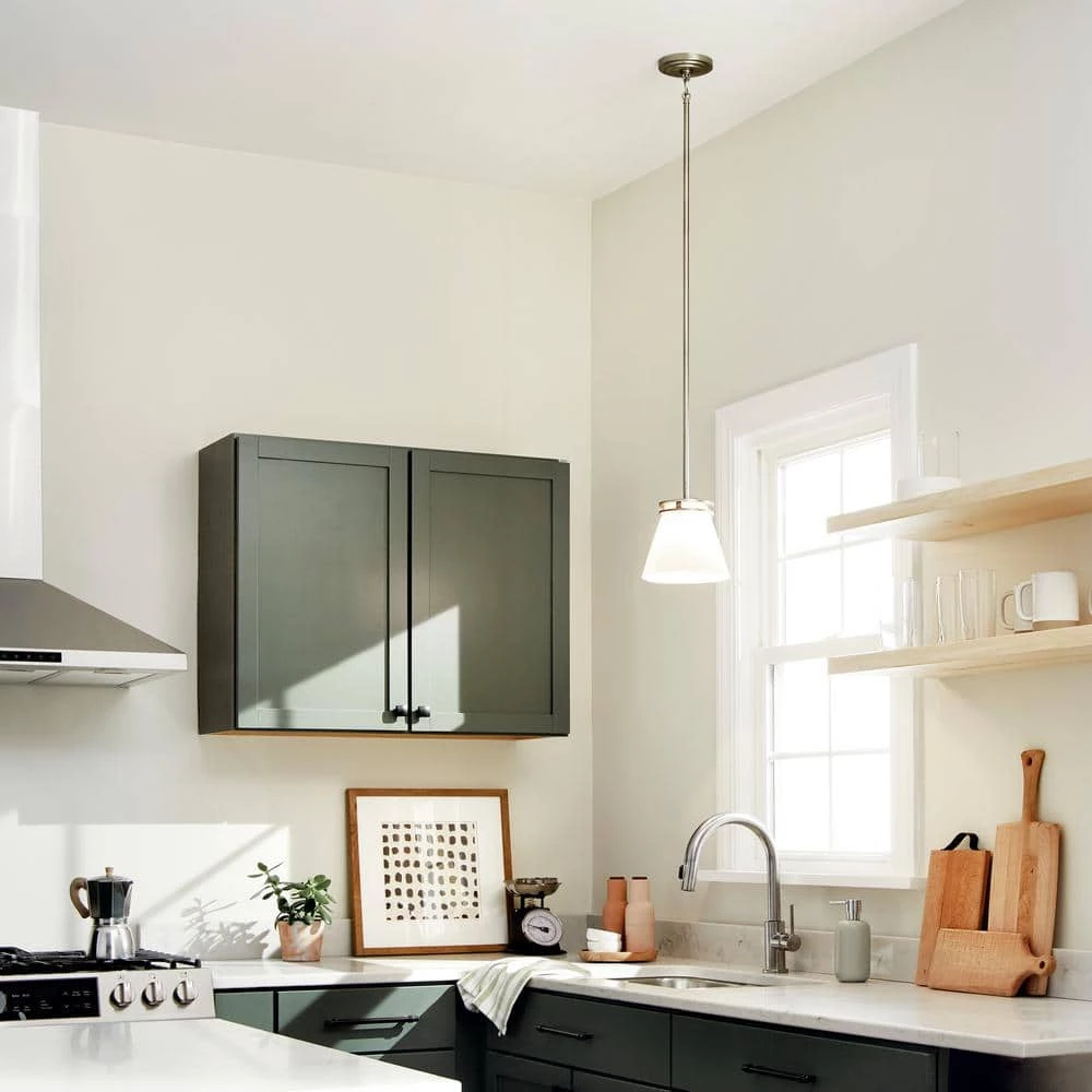 The Kichler Hendrik 8.75 in. 1-Light Brushed Nickel Mini Pendant Light adds elegant lighting to your living space. It features a satin etched cased opal glass diffuser that provides ambient lighting to the room. With its brushed nickel finish, this pendant light blends exceptionally well with both traditional and modern decor styles, among others.