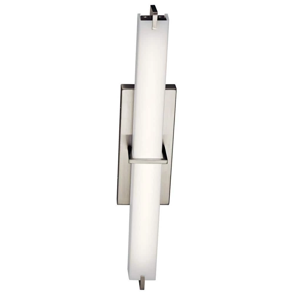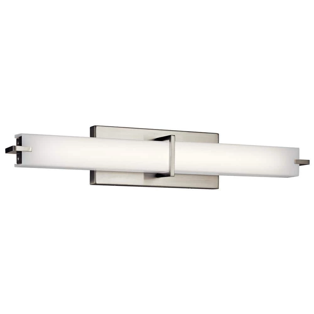 The KICHLER 26 in. Brushed Nickel Linear LED Vanity Light is ideal for illuminating your bath space. It features a dimmable LED lamp that allows you to adjust the brightness in the room. The lamp has a white acrylic diffuser that provides soft, ambient lighting. Its brushed nickel-finish backplate accentuates the visual appeal of your bath decor.