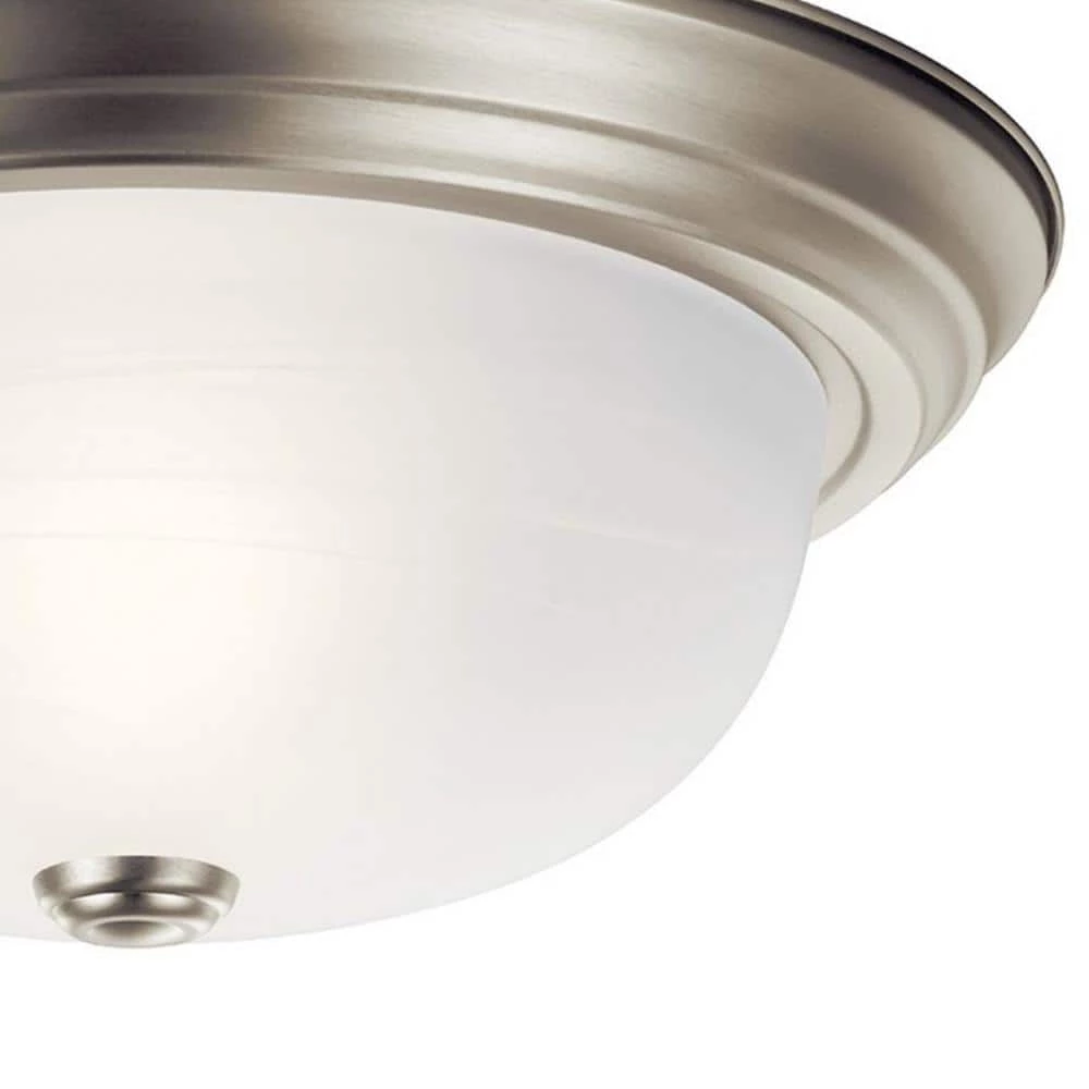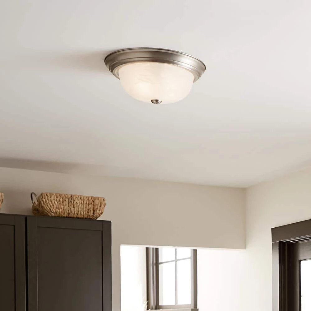 The KICHLER 13.25 in. 2-Light Brushed Nickel Flush Mount Light sports a unique design that complements most decor options. Featuring alabaster swirl glass diffuser, this Flush Mount light provides soft ambient lighting to your space. It is constructed of premium quality steel to ensure years of worry-free use. This Flush Mount light from KICHLER makes for an ideal choice to illuminate your living room, dining room, bedroom and more.