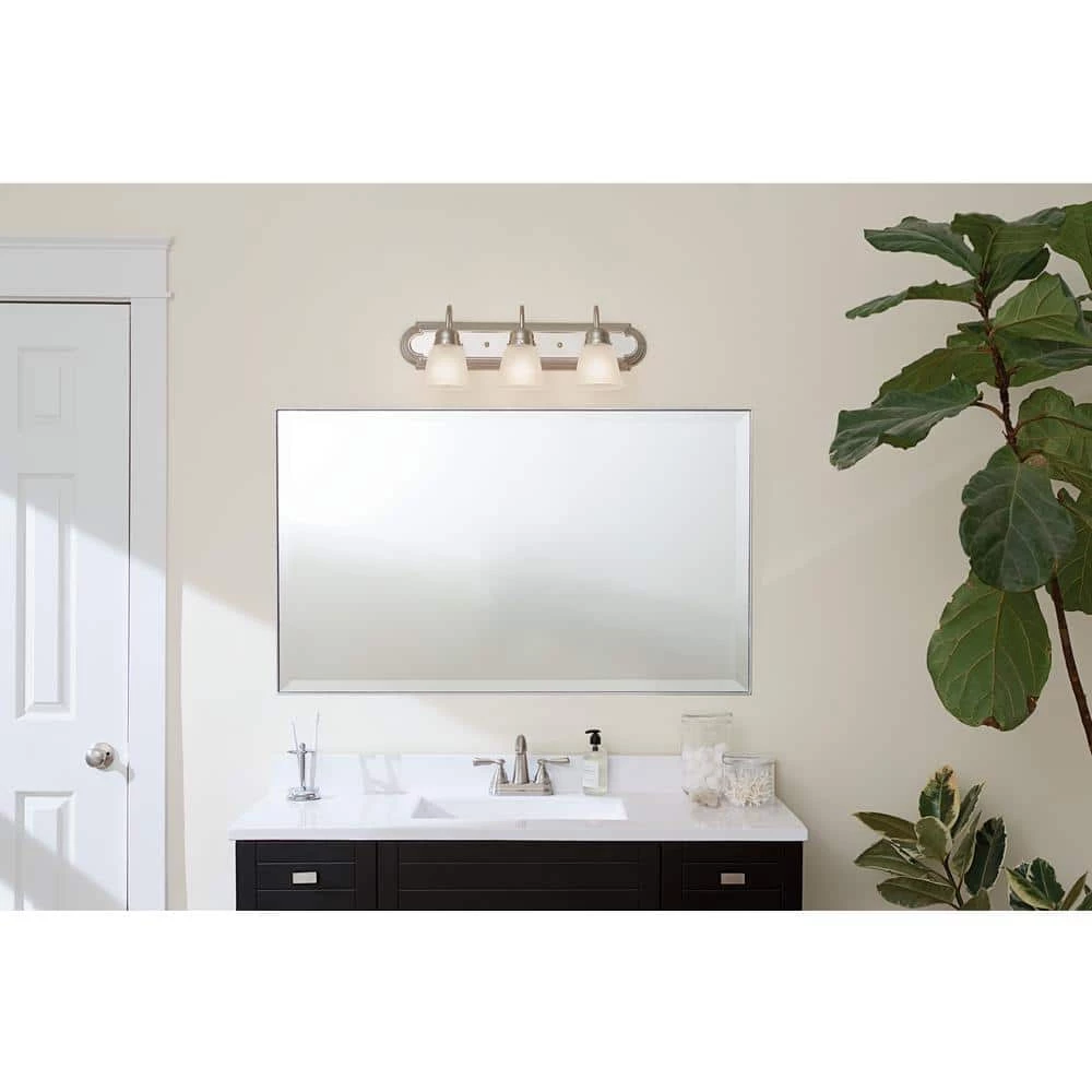 The KICHLER 24 in. 3-Light Brushed Nickel Vanity Light is ideal for illuminating your bath space. It comes with satin-etched glass diffusers that offer soft lighting. The vanity light features a brushed nickel finish that accentuates the visual appeal of any bath decor. This vanity light can be installed with the bulbs facing either up or down as per your preference.