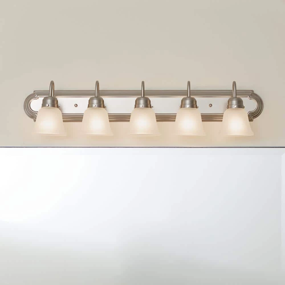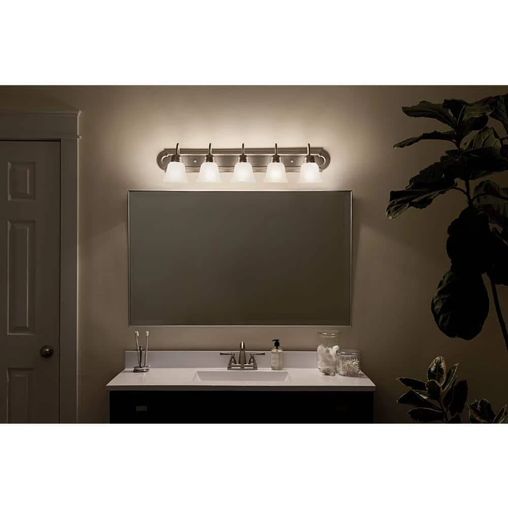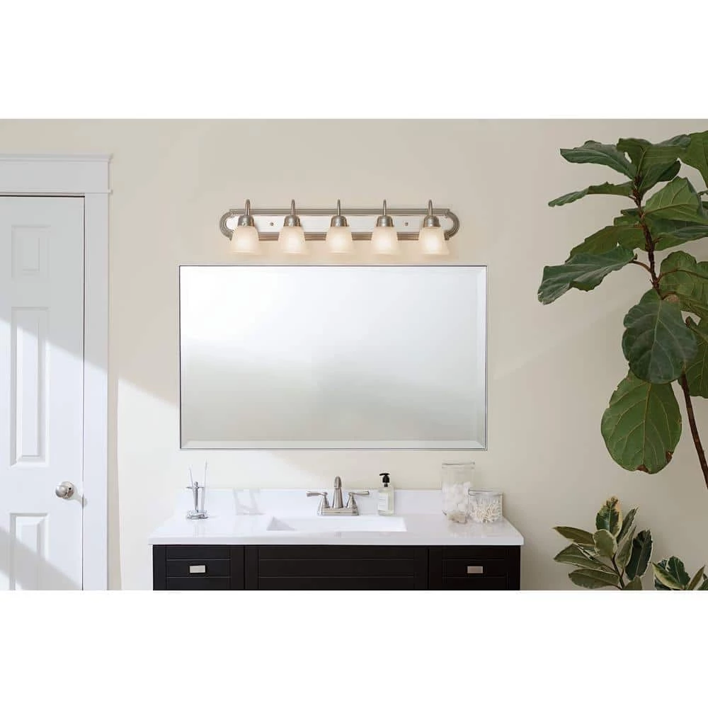 The KICHLER 36 in. 5-Light Brushed Nickel Vanity Light is ideal for illuminating your bath space or powder room. It holds 5 incandescent bulbs to offer optimal illumination. The vanity light comes with satin-etched glass diffusers for soft lighting. Its robust steel backplate with a brushed nickel finish enhances the appeal of any bath decor. This vanity light can be mounted either with bulbs facing upwards or downwards as per your preference.