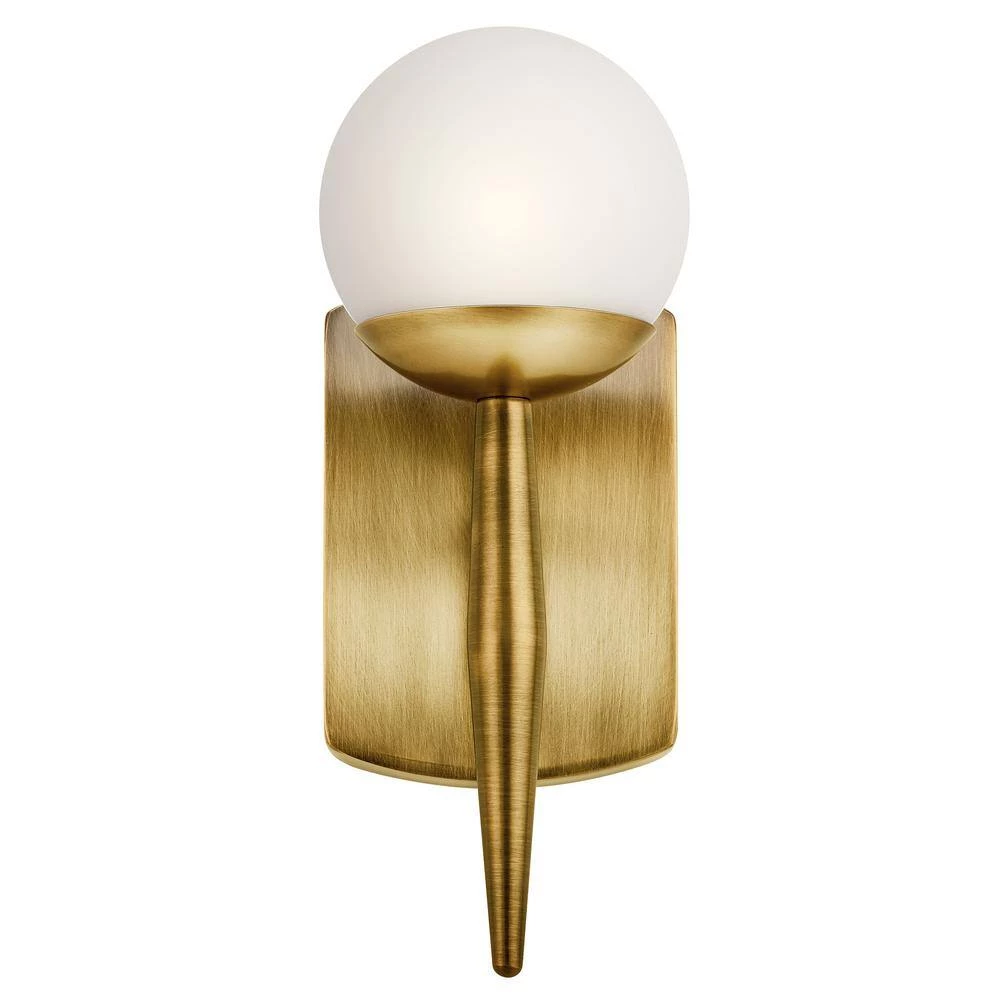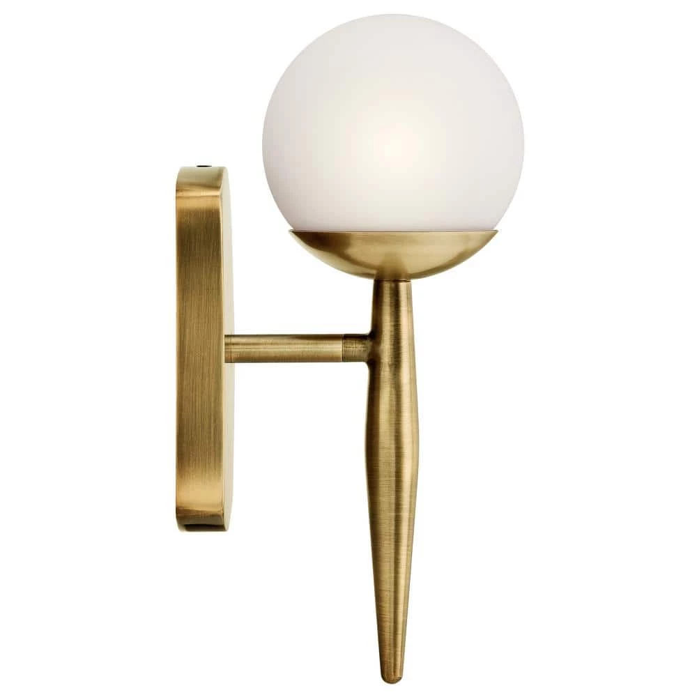 Add a mid-century charm to your room with the KICHLER Jasper 11.5 in. 1-Light Natural Brass Halogen Wall Sconce. It features a unique globe-shaped satin etched cased opal glass diffuser that provides soft, ambient lighting. Install this light facing down or up as per preference: turn the shade down to highlight a mirror or an art piece or turn it up, towards the ceiling for a soft ambient light appeal. This wall sconce is an ideal choice for your bathroom, vanity and powder room.