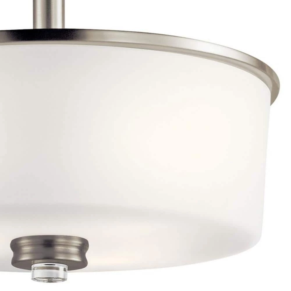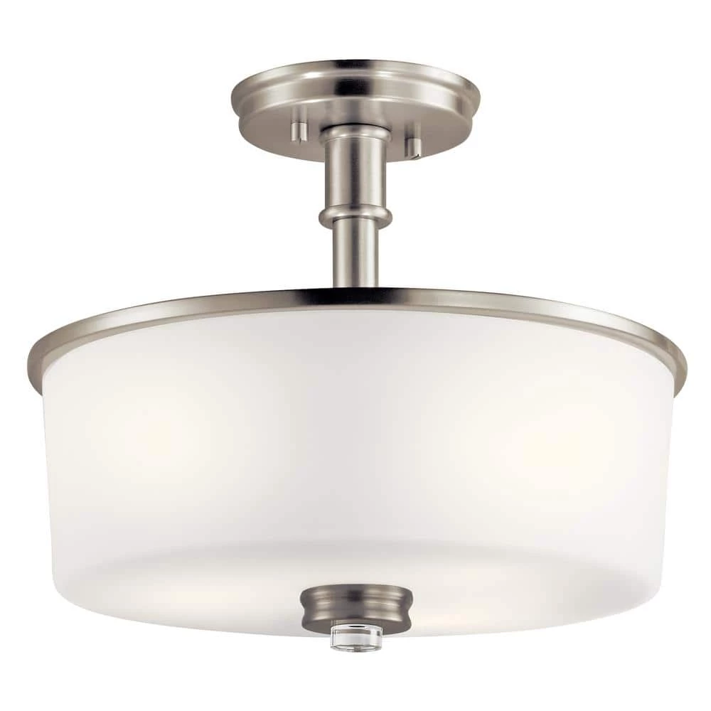 The KICHLER Joelson 14.25 in. 3-Light Brushed Nickel Semi-Flush Light accentuates the look of your interiors. It features retro-inspired bulb sockets with a satin etched white glass diffuser to provide a soft glow to your room. This semi-flush light has a brushed nickel finish that enhances the visual appeal of your living room, bedroom, foyer and more.