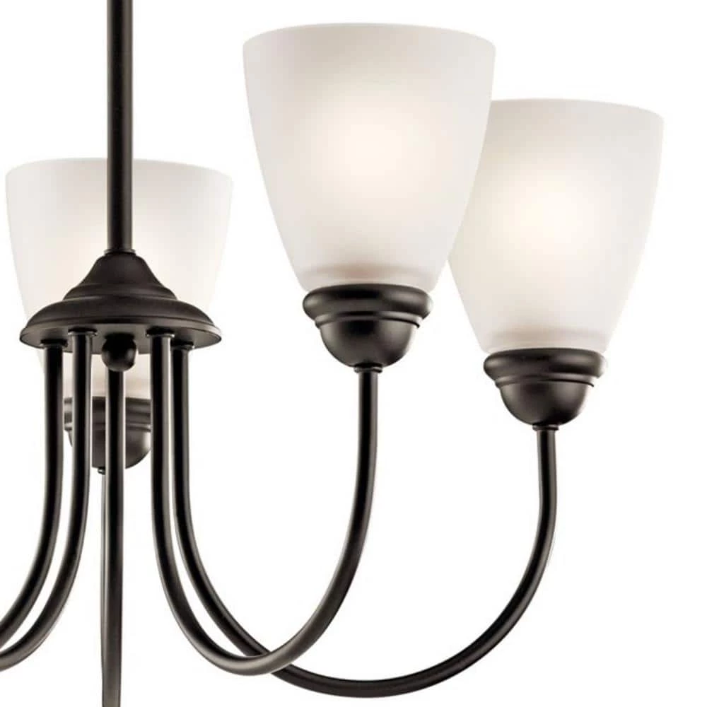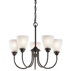 The Kichler Jolie 18.5 in. 5-Light Olde Bronze Chandelier adds a warm and welcoming glow to your home. Its simple yet elegant design accentuates your decor. This chandelier features satin etched glass diffusers that provide a warm, soothing glow to illuminate your space. With its attractive bronze finish, this chandelier blends well with a variety of home decor styles.