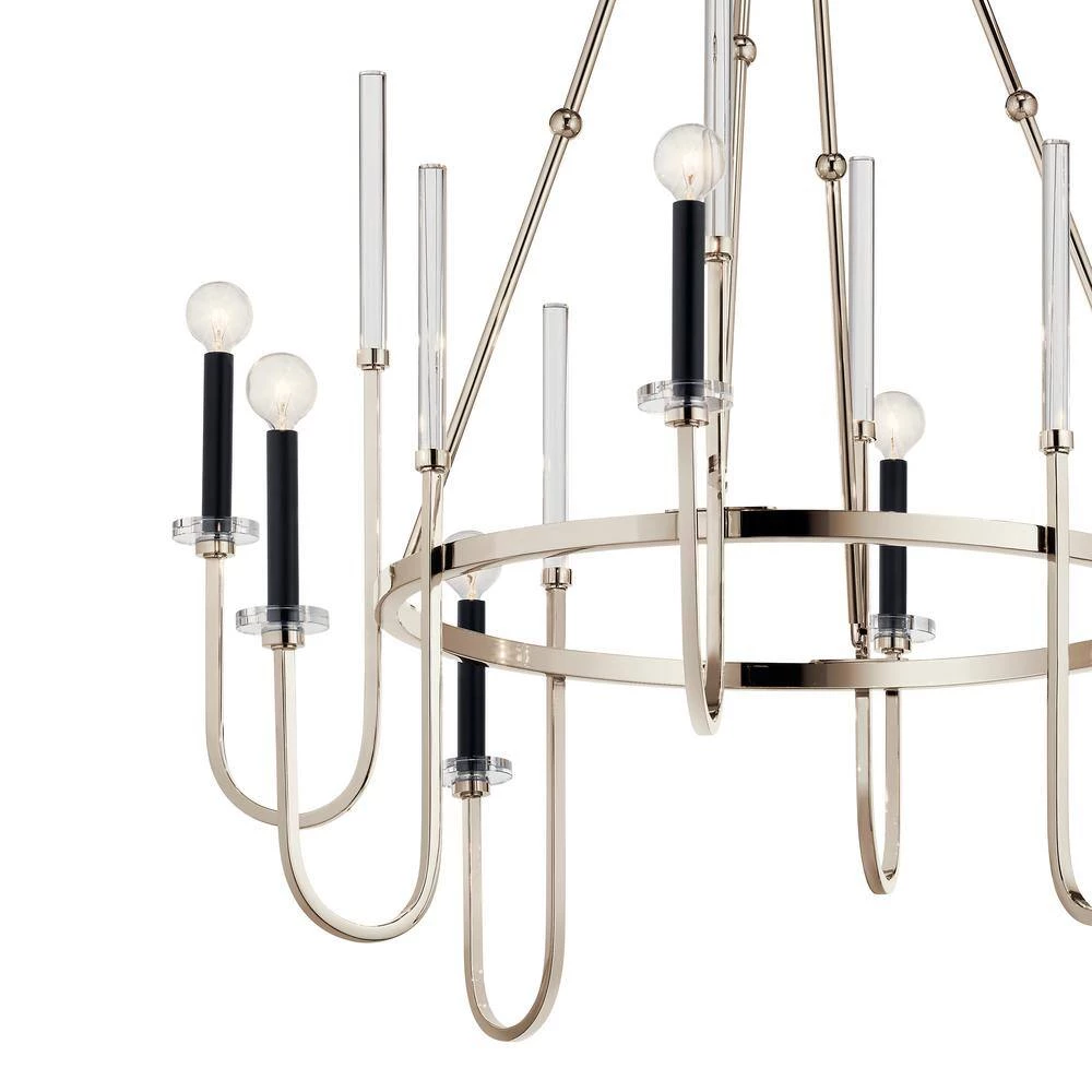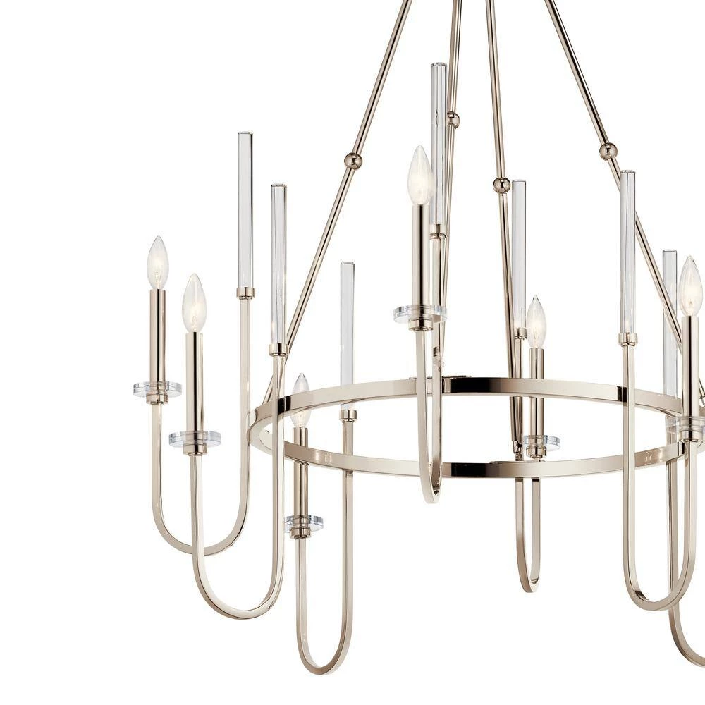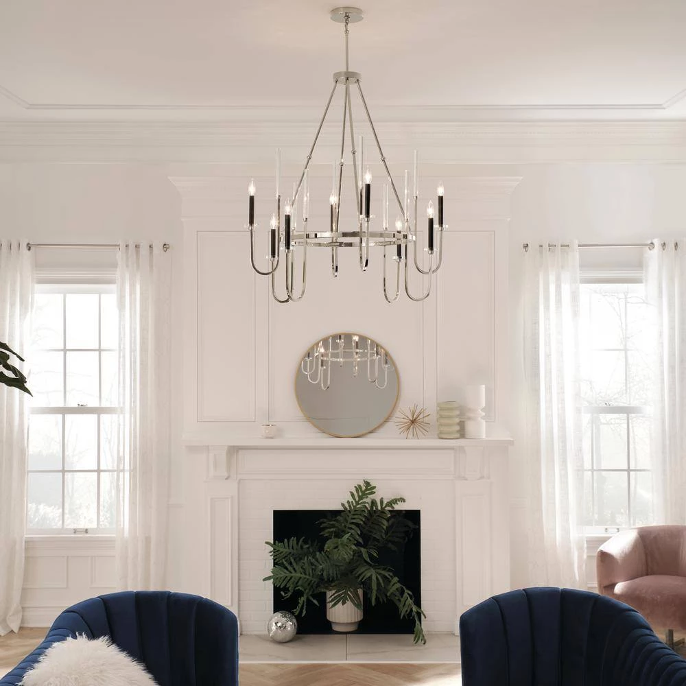 The KICHLER Kadas 40.75 in. 8-Light Polished Nickel Chandelier features interchangeable candle sleeves that offer dual styling options. It has a retro design with a polished nickel finish that adds traditional elegance to your decor. The chandelier is safe for use in dry locations, making it an excellent addition to your living room.