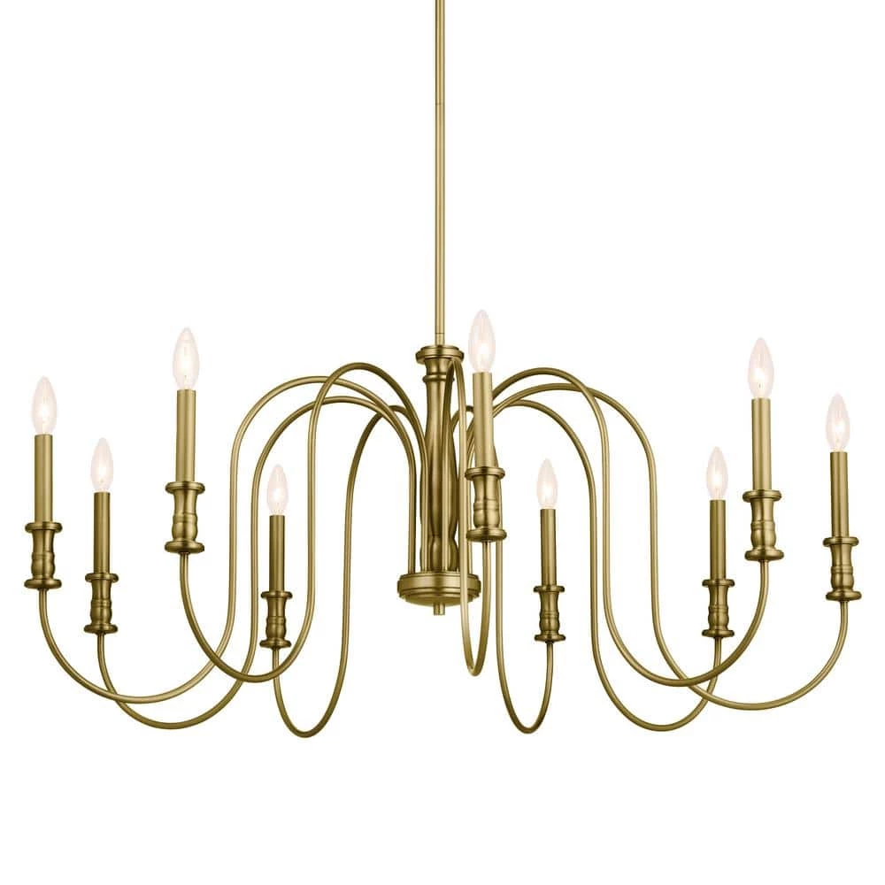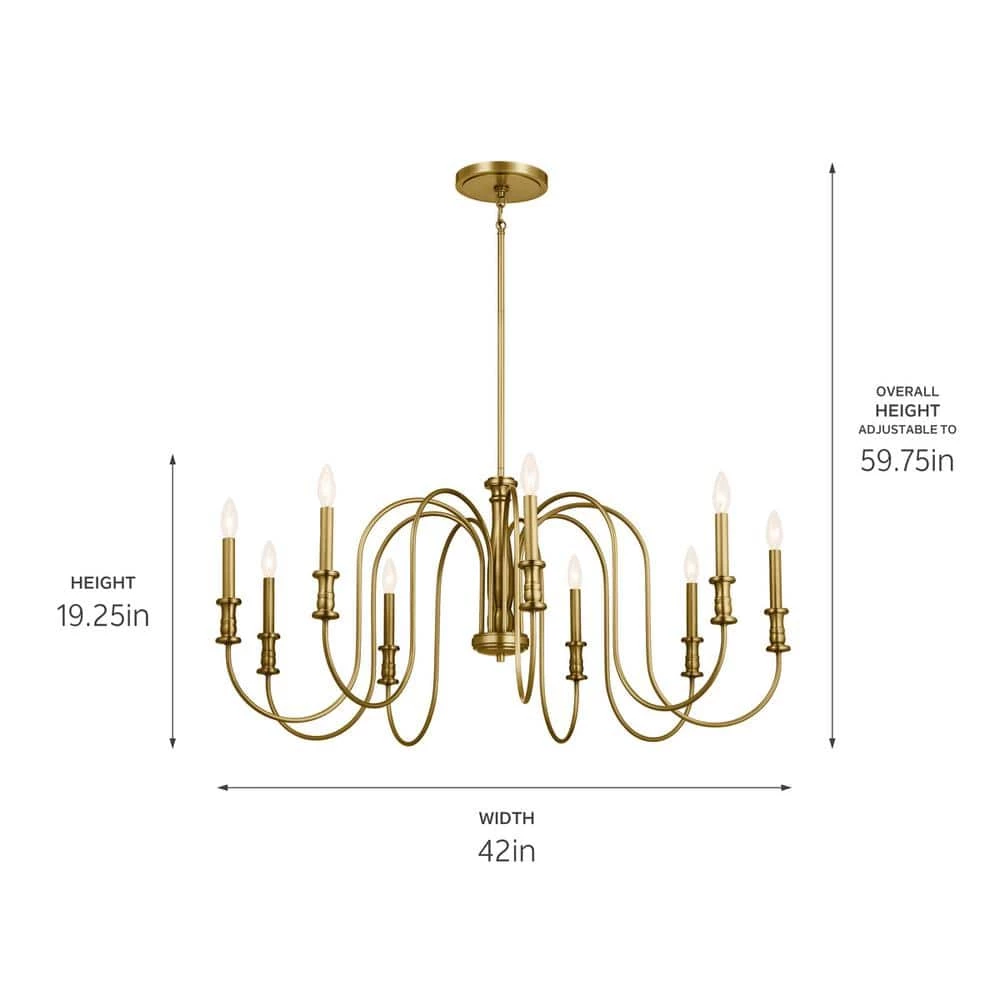 Light, airy and refined, the Karthe collection celebrates turned elements and a nod to heirloom quality details. Karthe is classic and brings casual elegance into your home. Sweeping arms keep this Karthe 9 light chandelier light and airy. Its Natural Brass finish beautifully shows off the turned spindle details. Illuminate your space with its casual elegance.