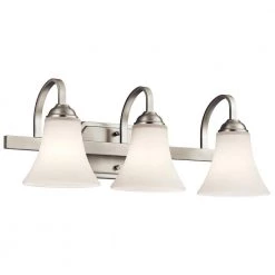 The KICHLER Keiran 22 in. 3-Light Brushed Nickel Vanity Light lends a soft yet stylish touch to your space. The beautiful satin etched glass shades impart a pleasant glow for a relaxed ambiance. With a robust frame featuring a radiant brushed nickel finish, this vanity light is a great addition to your bath space.