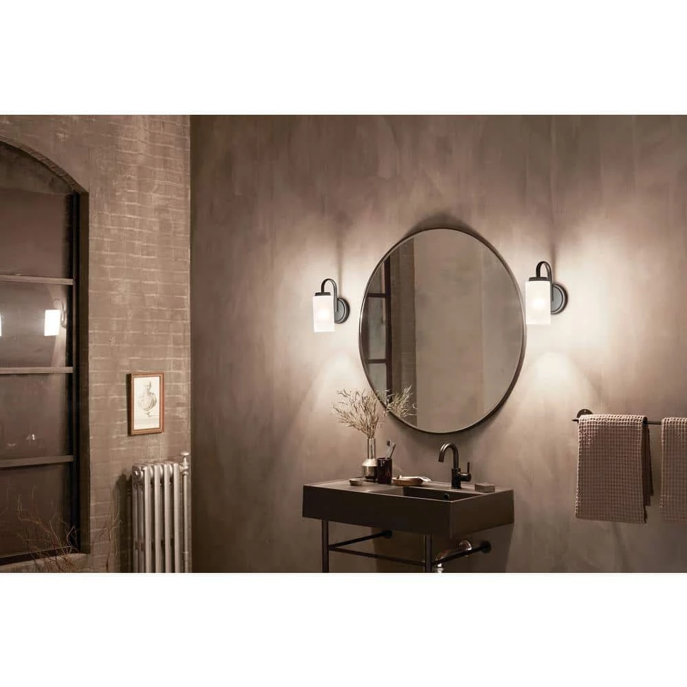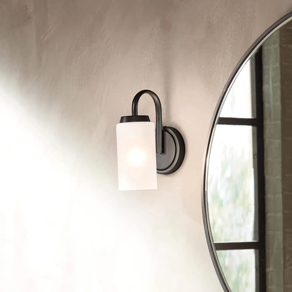 Sprinkling nostalgia into the present day is what the Kennewick collection is all about. It features classic silhouettes and gentle curves for a sophistication all its own. The Kennewick 1 light wall sconce features a beautifully Etched Glass shade that can face up or down, depending on your preference. It’s Black finish complements your bathroom fixtures. With clean curves and smooth lines, this light’s simplicity is refreshing.