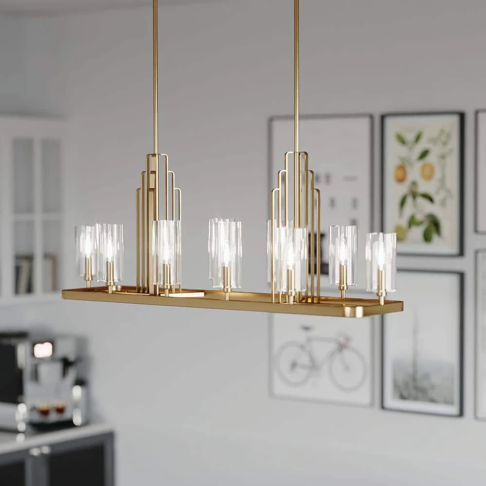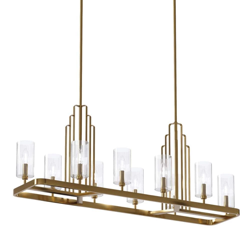 Inspired by the Art Deco details on Madison Belmont Building in New York City, the Kimrose collection is anything but ordinary. You may find yourself unable to look away, as you explore its bold geometric shapes, bright finishes, and ribbed glass. Each piece is a work of art, and with lux Art Deco style trending, that’s exactly what we want. The Kimrose 10-light linear chandelier is an Art Deco masterpiece. Its geometric shapes take center stage in a gorgeous Brushed Natural Brass finish. The shades are Clear Fluted Glass, meaning they’re ribbed gently with vertical grooves to produce a subtle lighting effect. For lighting without the effect, simply remove the shades.