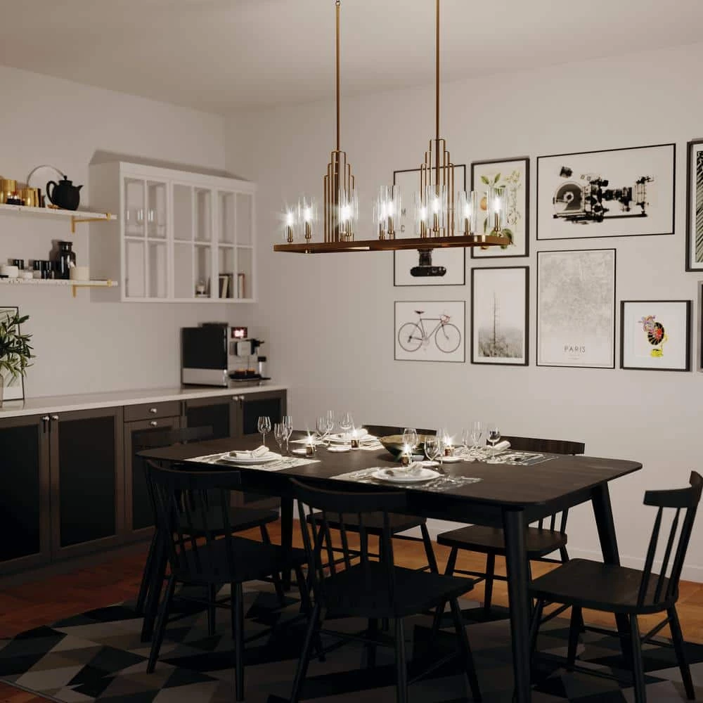 - Make an impression with this linear chandelier over a long table in a dining room or kitchen