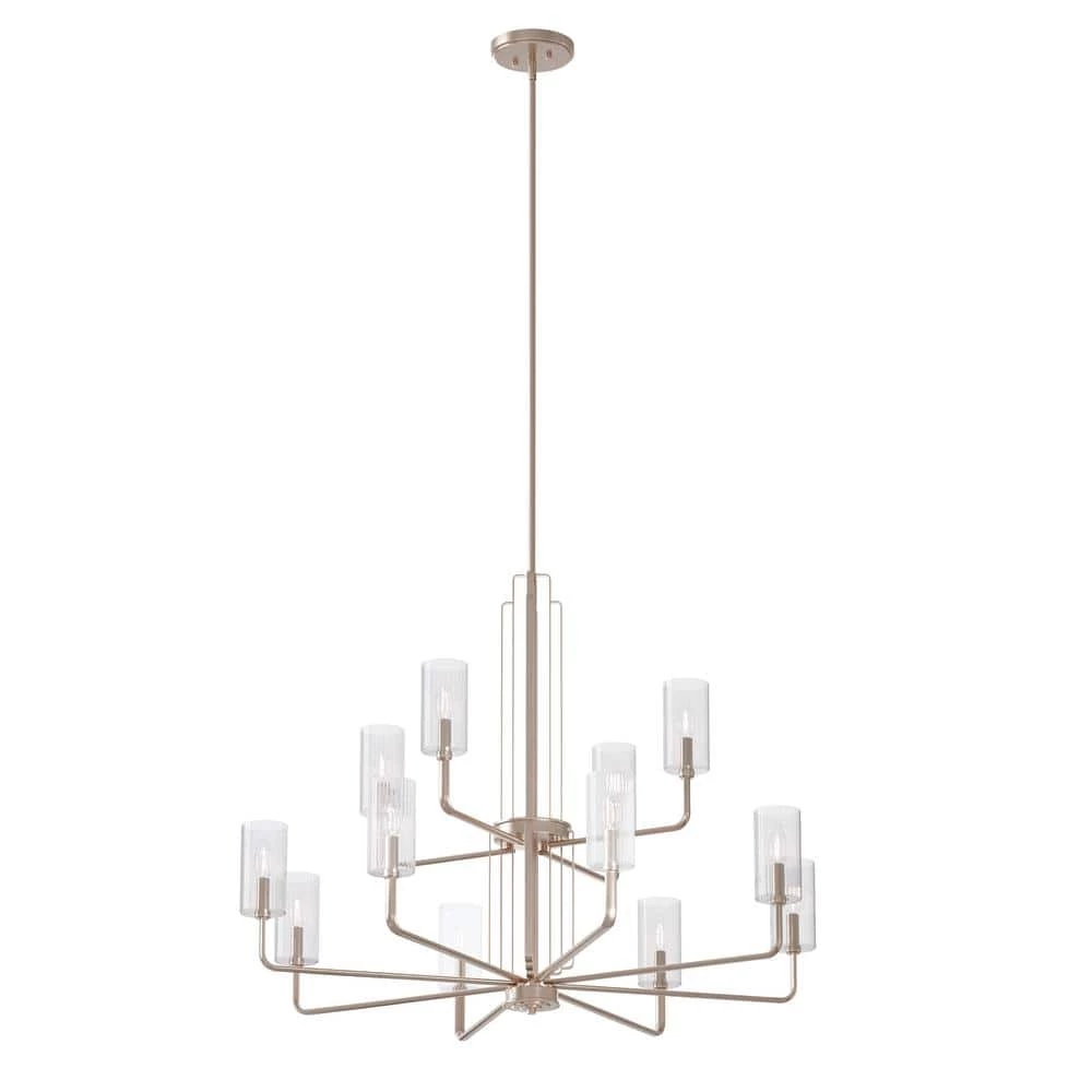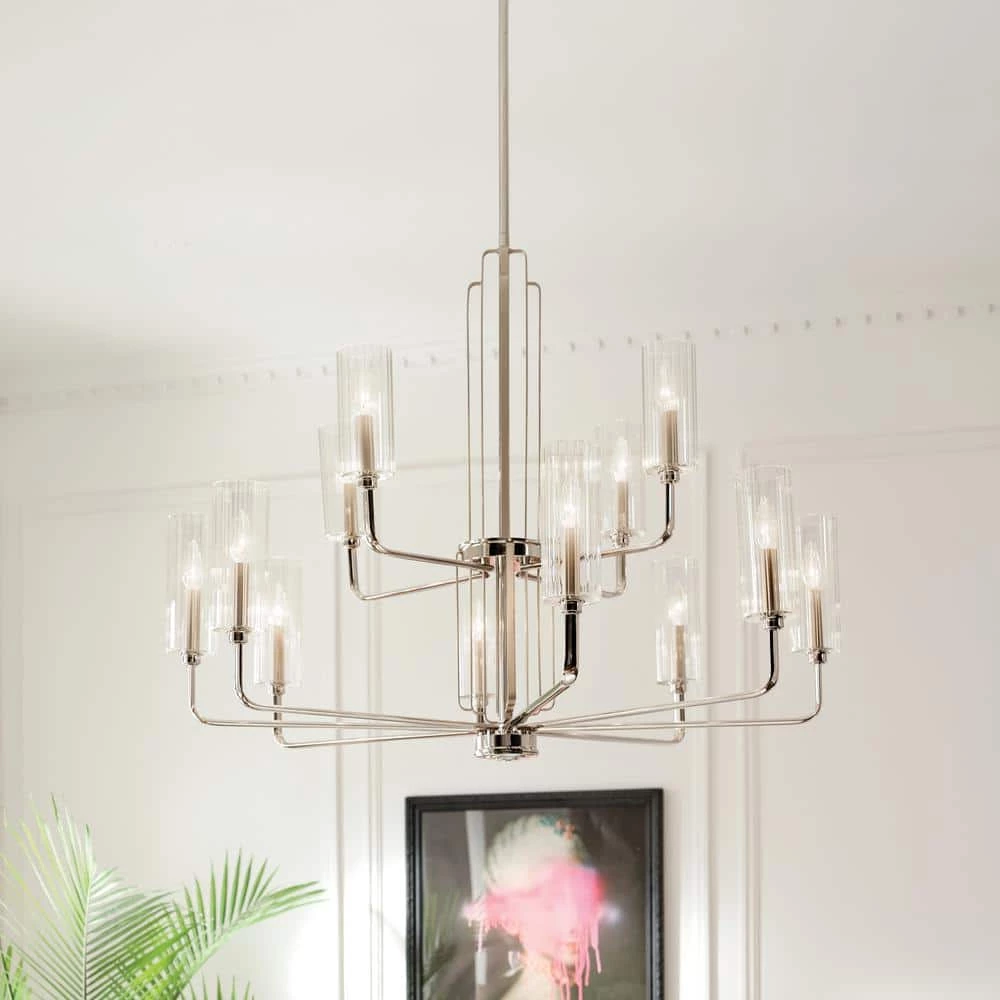 Inspired by the Art Deco details on Madison Belmont Building in New York City, the Kimrose collection is anything but ordinary. You may find yourself unable to look away, as you explore its bold geometric shapes, bright finishes, and ribbed glass. Each piece is a work of art, and with lux Art Deco style trending, that’s exactly what we want. The Kimrose 12-light chandelier is an Art Deco masterpiece. Its geometric shapes take center stage in a gorgeous mix of Polished Nickel and Satin Nickel finishes. The shades are Clear Fluted Glass, meaning they’re ribbed gently with vertical grooves to produce a subtle lighting effect. For lighting without the effect, simply remove the shades.