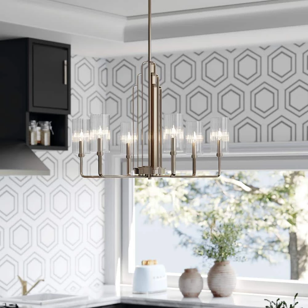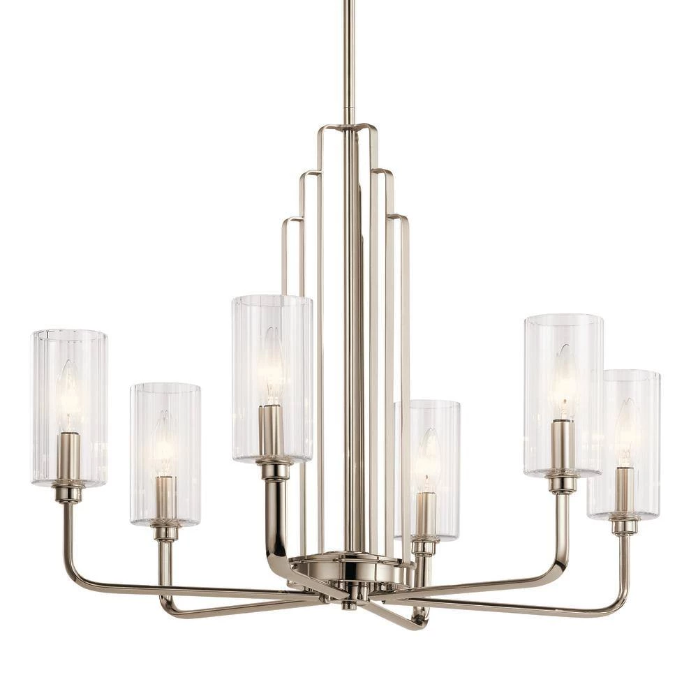 Inspired by the Art Deco details on Madison Belmont Building in New York City, the Kimrose collection is anything but ordinary. You may find yourself unable to look away, as you explore its bold geometric shapes, bright finishes and ribbed glass. Each piece is a work of art and with lux Art Deco style trending, that’s exactly what we want. The Kimrose 6-light chandelier is an Art Deco masterpiece. Its geometric shapes take center stage in a gorgeous mix of Polished Nickel and Satin Nickel finishes. The shades are Clear Fluted Glass, meaning they’re ribbed gently with vertical grooves to produce a subtle lighting effect. For lighting without the effect, simply remove the shades.