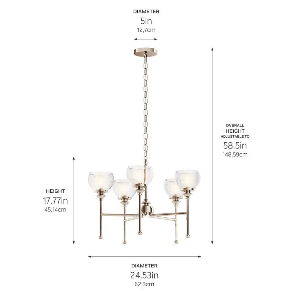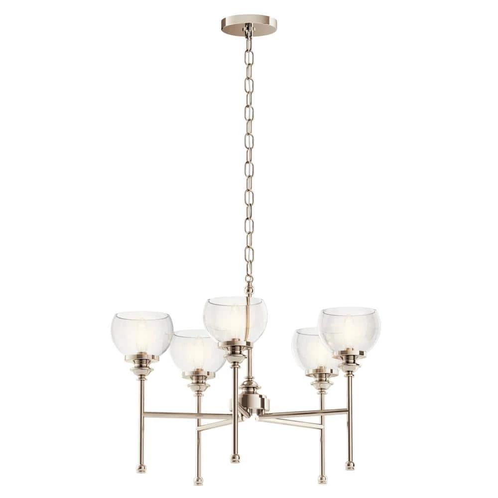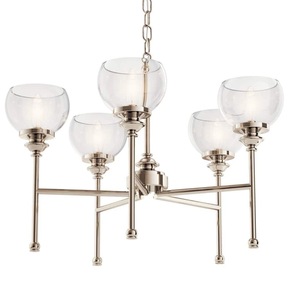 With its light and airy silhouette, the simplified, updated traditional look of the Lecelles 5-light chandelier offers an elegant, sophisticated presence while its Polished Nickel finish complements its form. Inspired by silver candlesticks seen in a Lake Como antique shop, Lecelles is both aspirational and luxurious. With elongated stems, repetition of ornate details and unique, wine-goblet-shaped clear glass, you’ll enjoy a fixture that outwardly celebrates purity of form and attention to detail.
