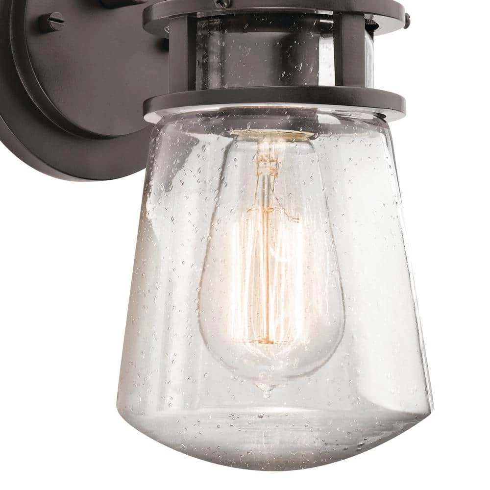 Spruce up your entryway or porch with the Lyndon 11.25 in. Wall Light from KICHLER in Architectural Bronze finish. This wall light is made from durable aluminum and makes a great addition to your garage door or patio. The seeded glass enclosure protects the unit from weather damage while providing optimum illumination. Its classic design along with a unique bronze finish seamlessly blends into transitional as well as nautical-style decor. Coated with highly durable finish, this lamp is designed to withstand sun exposure, rain, and snow. This light fixture comes equipped with stainless steel mounting hardware for convenient installation.