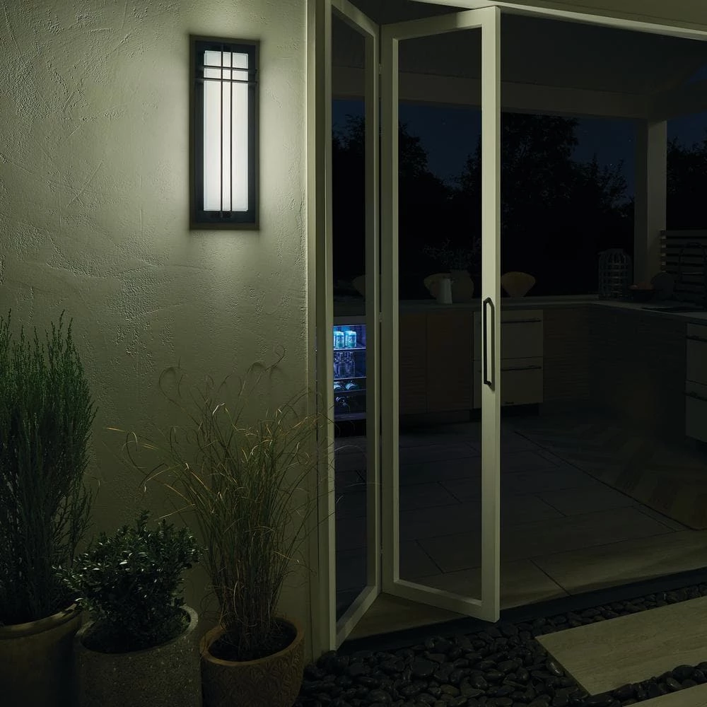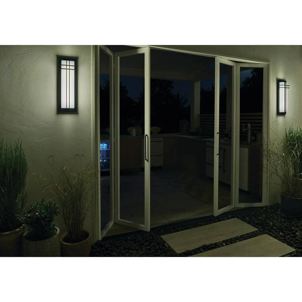 The KICHLER Manhattan 22 in. Textured Black LED Wall Light adds an elegant charm to your outdoor decor. It features a white glass diffuser to provide a soft, warm glow when illuminated. The energy-efficient LED lamps are fully dimmable and let you control the brightness as per preference. It is constructed from aluminum to ensure durability and years of reliable use. This wall light from KICHLER is a suitable choice to brighten up your entryway, garage door, patio, porch, and more.