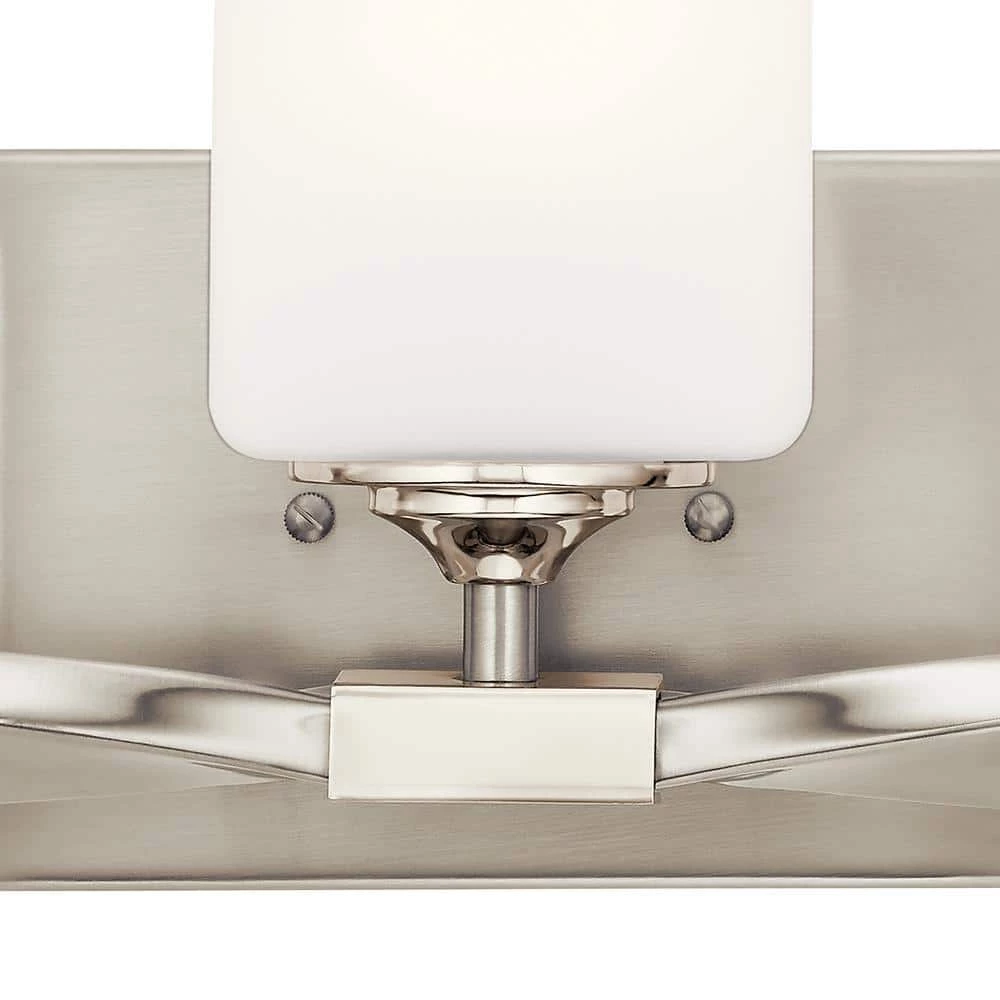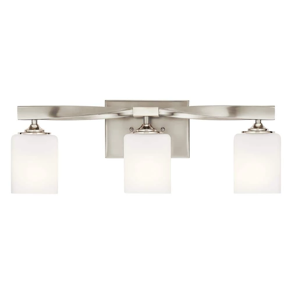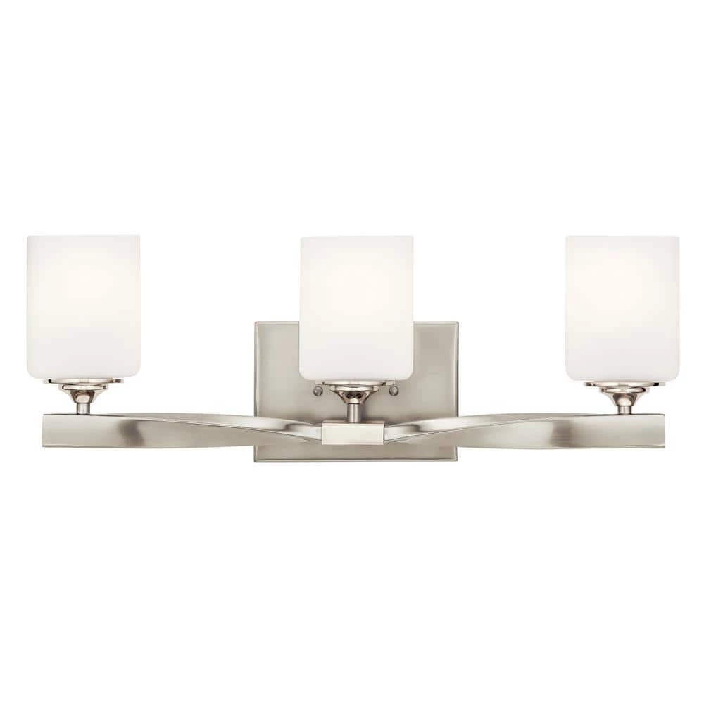 Beautify the look of your bathroom vanity with this stunning KICHLER Marette 22.75 in. 3-Light Brushed Nickel Vanity light. The 2 elegantly crafted satin etched opal shades sit on a twisted arm to create a unique look. A radiant brushed nickel finish makes this vanity light perfectly versatile for a number of decor styles.