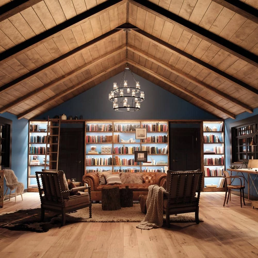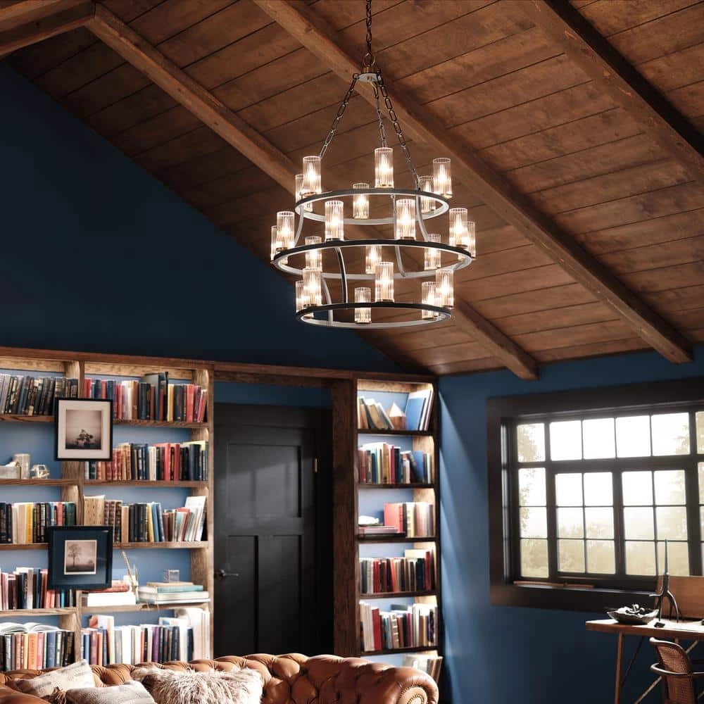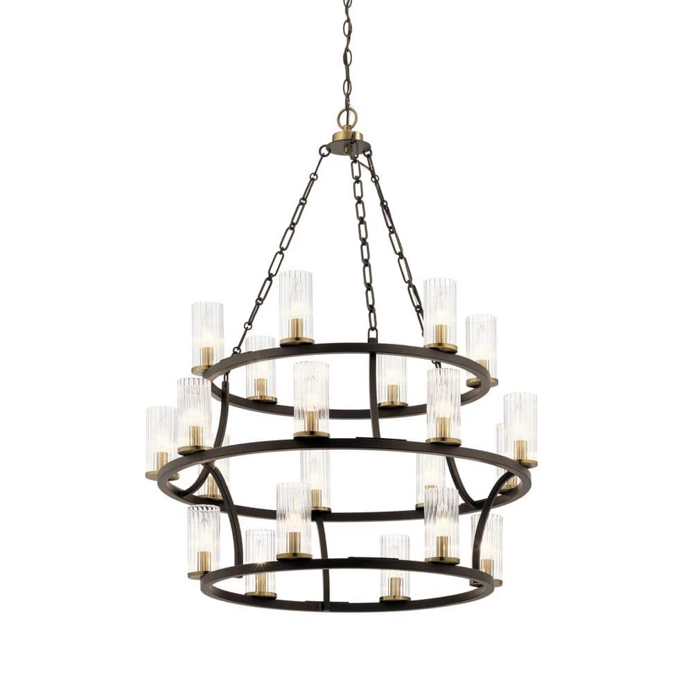 Add a touch of rustic elegance to your decor with the KICHLER Mathias 41.25 in. 21-Light Olde Bronze 3-tier Chandelier. It features a distinctive chain-hung design that complements most decor styles. This chandelier has clear ribbed glass diffusers for bright illumination. Its durable steel frame construction ensures long-life and minimized maintenance.