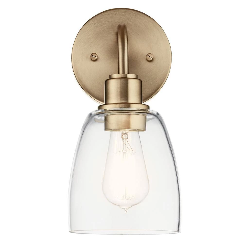 - The Meller 11.25 inch 1 light wall sconce features a round backplate and curved arm finished in Champagne Bronze, the Clear Glass shade puts the vintage bulb on display