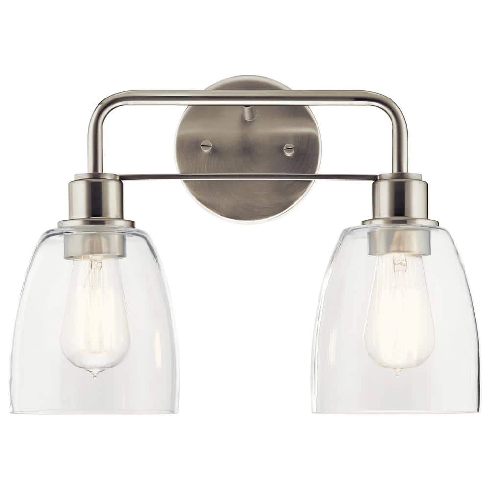 - The Meller 15.25 inch 2 light vanity light features a round backplate and curved arms finished in Brushed Nickel; clear Glass shades put the vintage bulbs on display