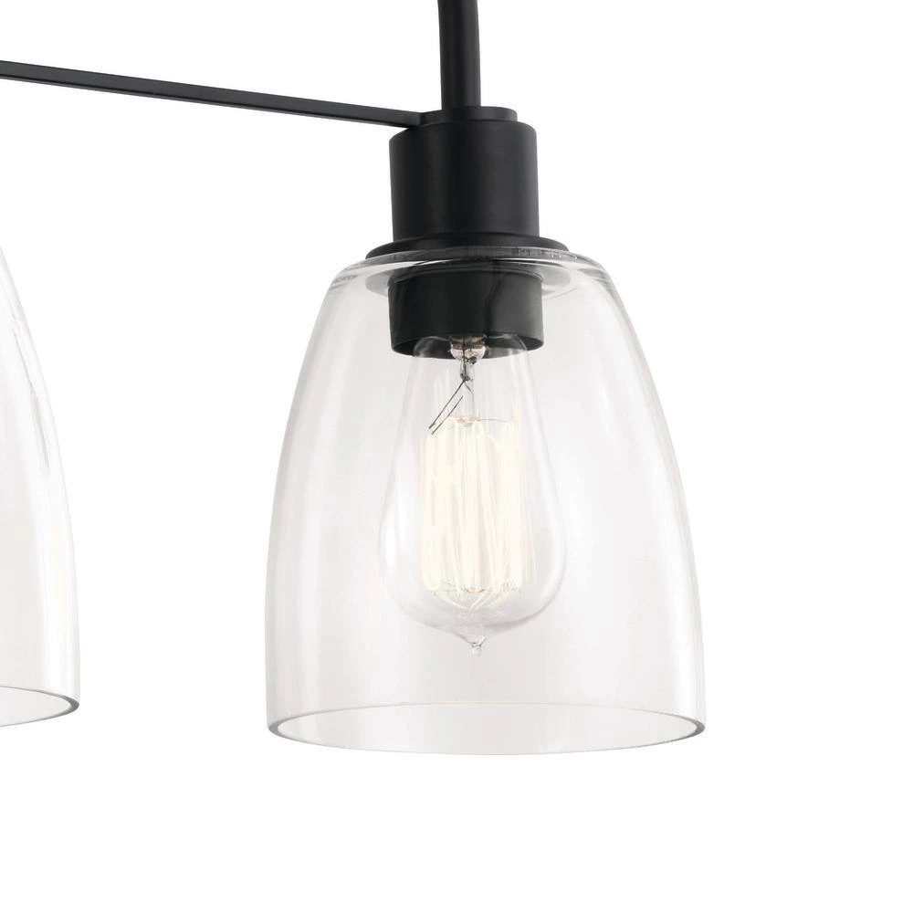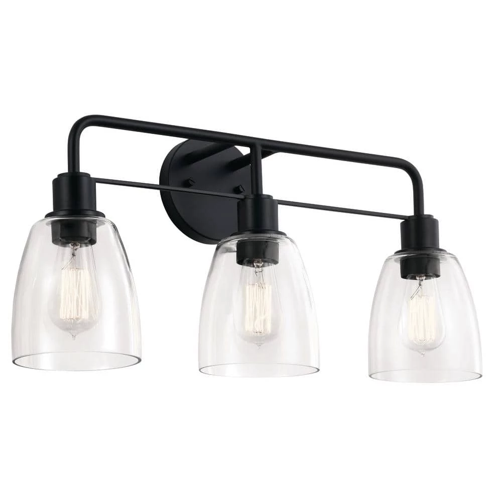 The Meller collection evokes images of wrought iron fence gates. During the Industrial Revolution, people installed the gates to protect their side yards while still allowing light to come through for growing plants. With its strong black finish and curved, clear glass, the Meller collection brings home an evolved industrial style, 1 that’s slightly more polished, minimal and un-cluttered. Like the days of old, it brings home light. The Meller 24 in. 3-light vanity light manifests utilitarian design at its most refined. A round backplate and curved arms finished in Black, the industrial color of choice, give the piece a graceful feel, while the Clear Glass shades put the vintage bulbs on display. This vanity light proves that, once again, there’s beauty in simplicity.