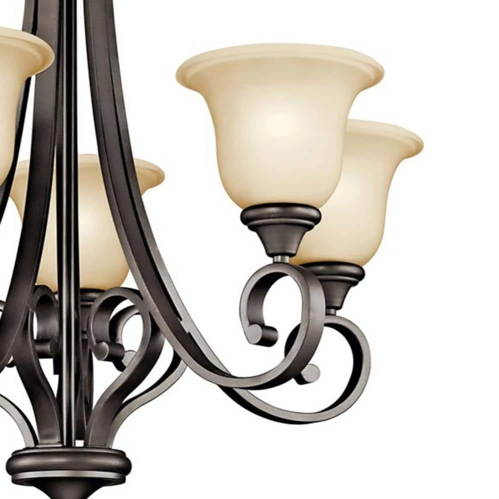 At Kichler we focus on innovation, technology, product performance, safety, and certification; we never stop identifying new ways to improve our products and services. We are committed to creating products that are crafted from the highest quality steel, glass, and integrated fasteners to deliver a fixture that is both beautiful and easy to install. We pride ourselves on rigorous in-house testing to ensure that our products meet the highest of industry standards and that our customer service team is here for you to help answer questions or guide you as you tackle a new lighting project. All these factors come together to ensure we’re continuously working to create a better and more effective way to help people see what matters most. The Kichler Monroe 29.5 in. 5-Light Olde Bronze Chandelier with Light Umber Etched Glass creates a stylish statement while offering optimum illumination. It features a light umber etched glass shade with a bronze finish for an enhanced visual appeal. This chandelier is made from premium quality steel to ensure strength and durability.