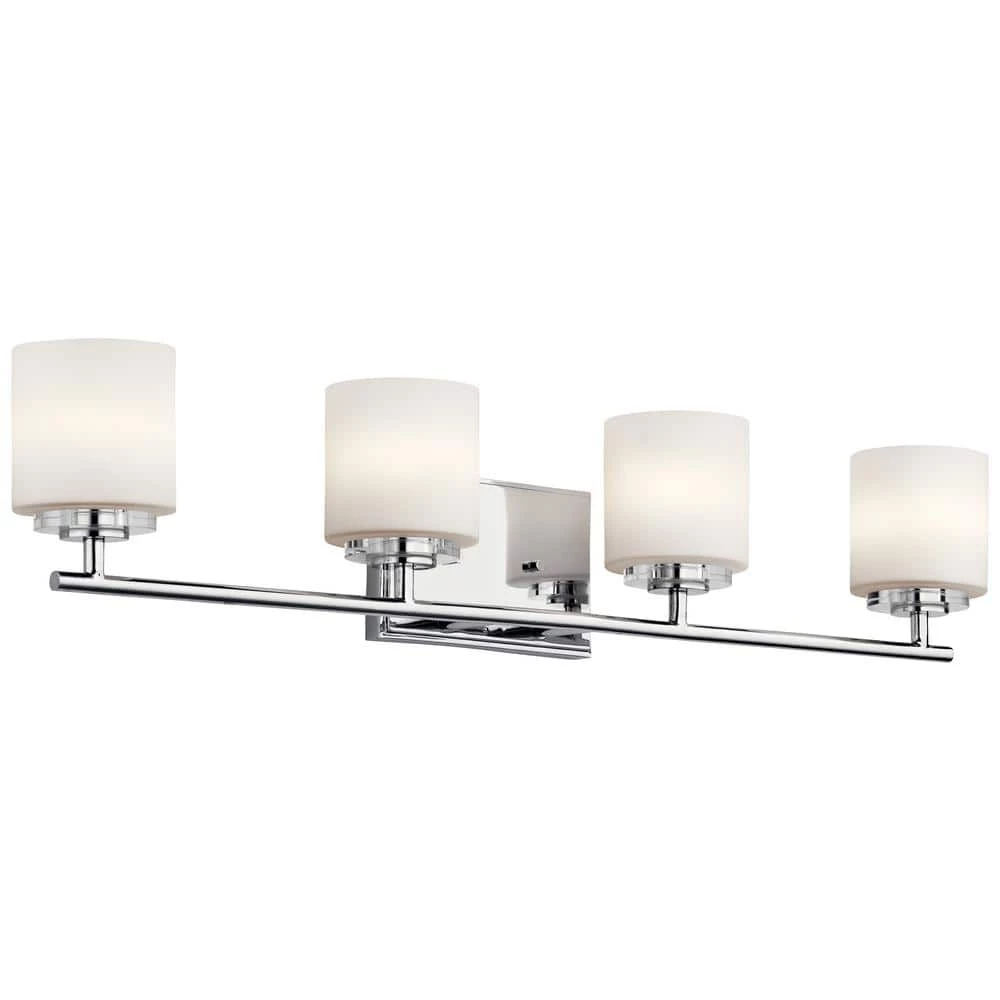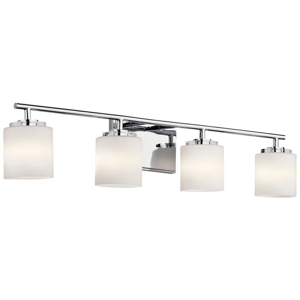 Embellish your bath space with this stunning KICHLER O’Hara 4-Light Chrome Vanity Light. The satin etched cased opal glass shades gently illuminate the area with a soft and relaxing glow. The durable steel frame features a scintillating chrome finish to add a sparkling touch to your decor.