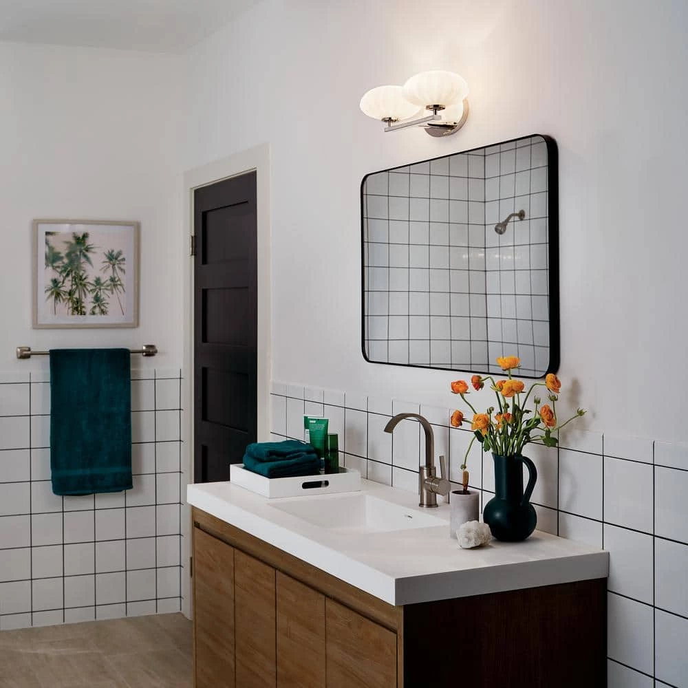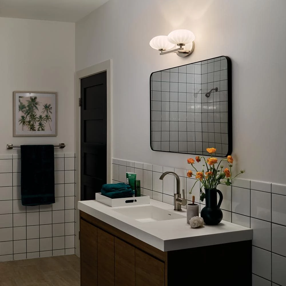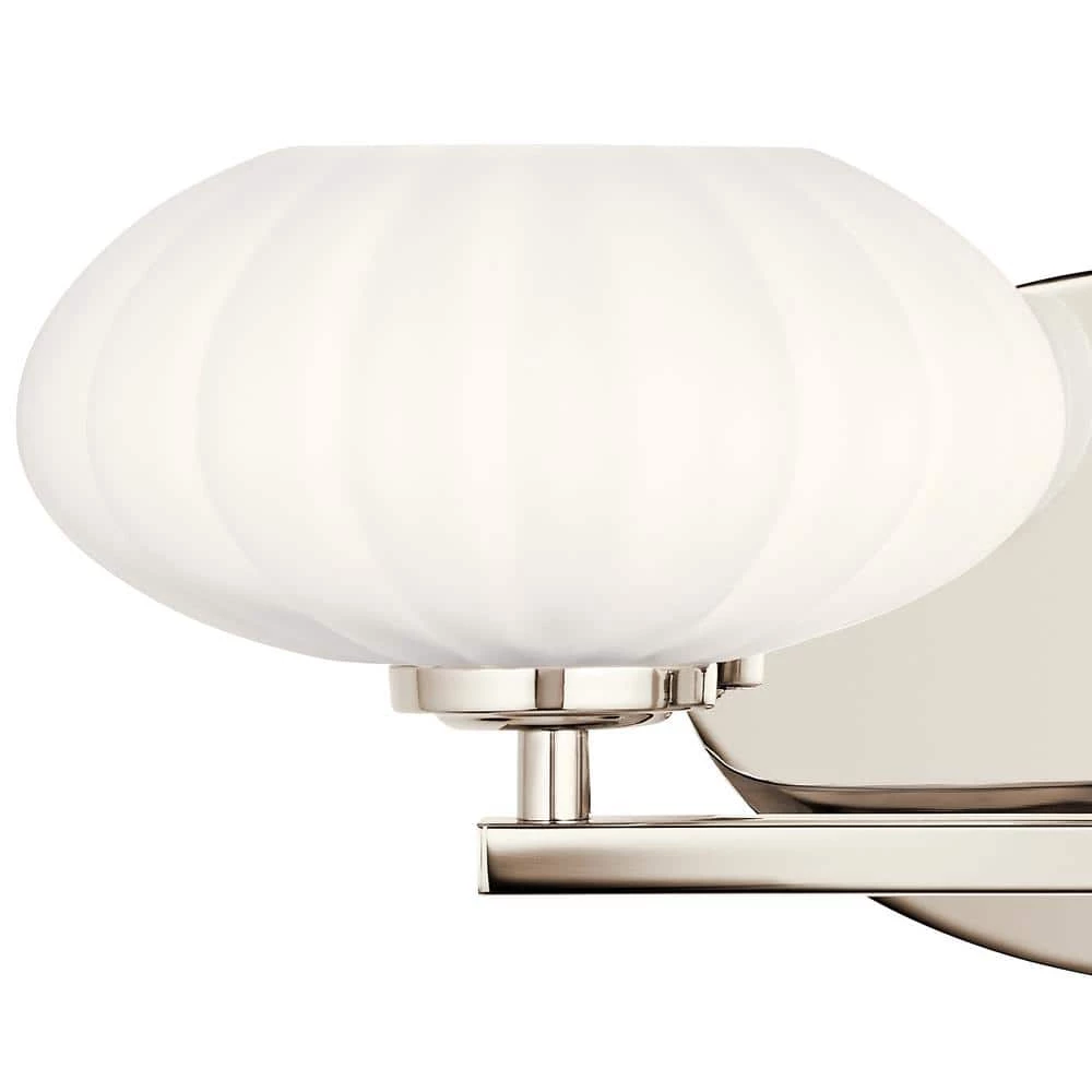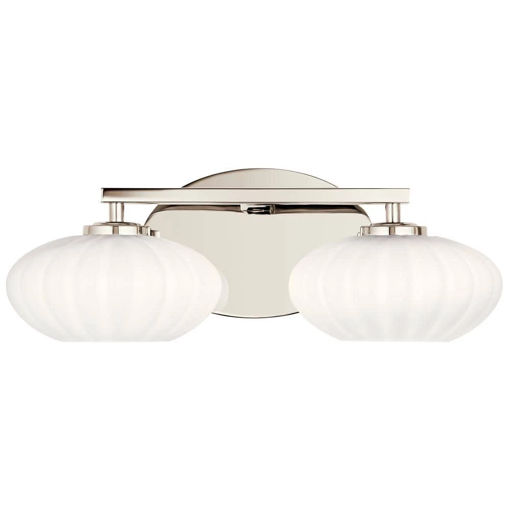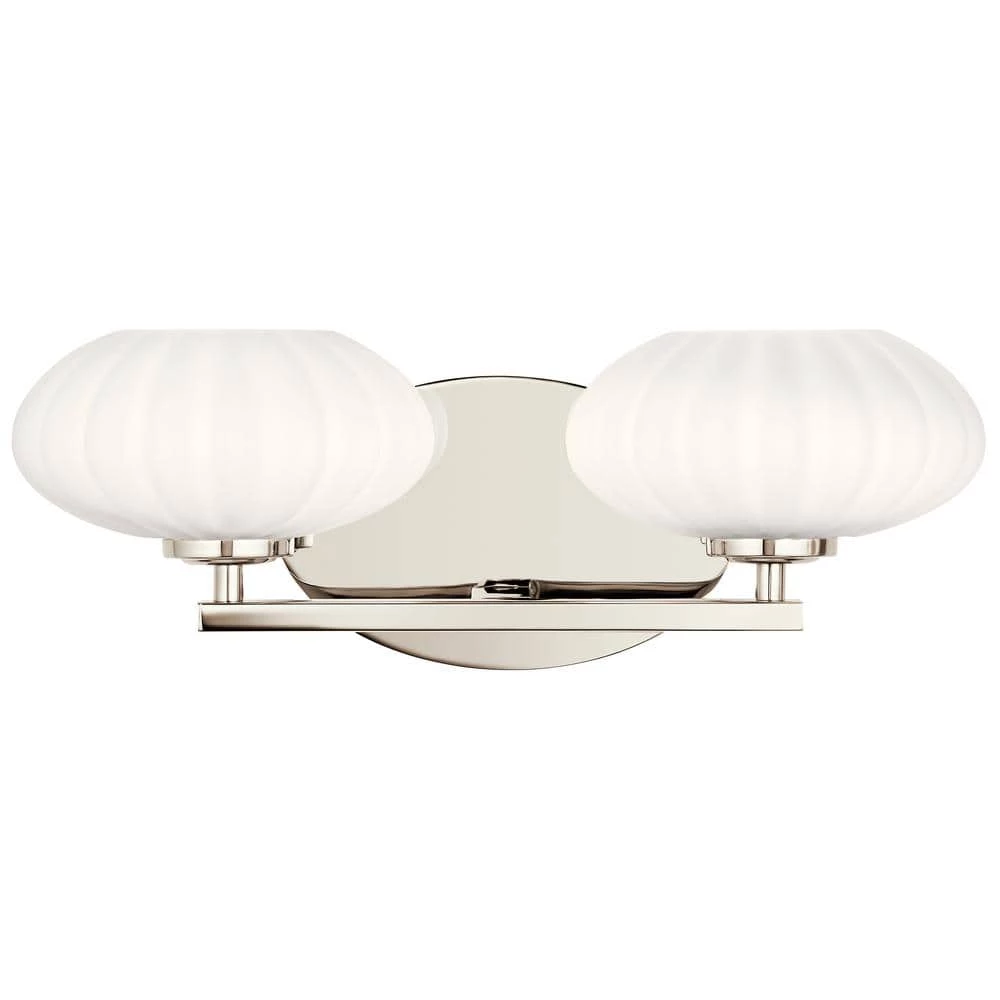 The KICHLER Pim 16 in. 2-Light Polished Nickel Vanity Light with Satin Etched Cased Opal Glass goes well with a contemporary- or transitional-style decor. Featuring 50-Watt bulbs with opal shades, this vanity light offers a soft glow for optimum illumination. It comes with a sturdy backplate and can be installed upwards or downwards depending on your usage. This vanity light from KICHLER is ETL rated for safe use in damp locations.