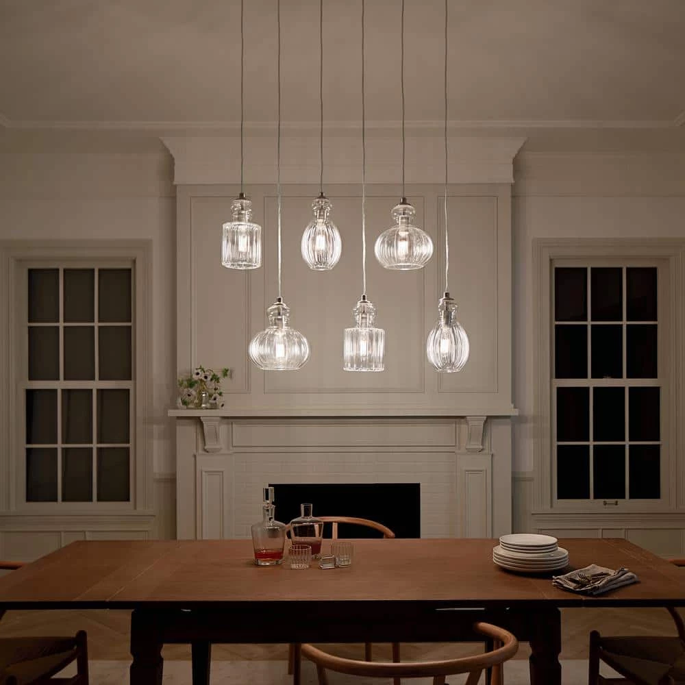 The Kichler Riviera 35.5 in. 6-Light Brushed Nickel Linear Chandelier features clear ribbed glass diffusers that provide bright illumination. It features an elegant retro design inspired by antique, vintage perfume bottles. The brushed nickel finish of this chandelier blends well with any transitional-style room decor. This magnificent chandelier from Kichler is sure to make for a striking addition to your living space.