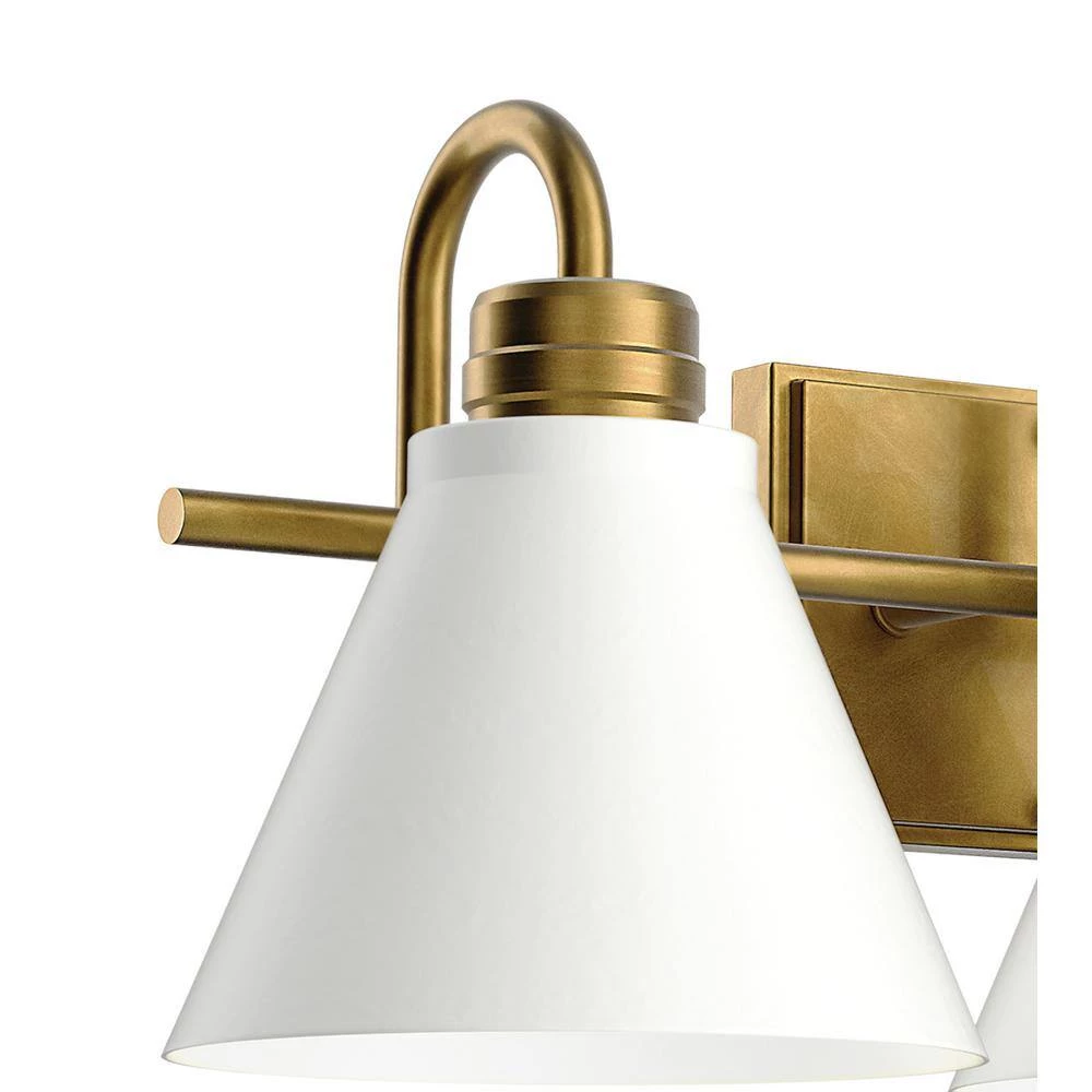 The Rosburg 3-light vanity light features a mixed finish style combining Natural Brass and White. The interior of the shades feature a White finish for maximum light output. This combination of finishes makes this piece perfect for modern farmhouse style bathrooms or powder rooms.