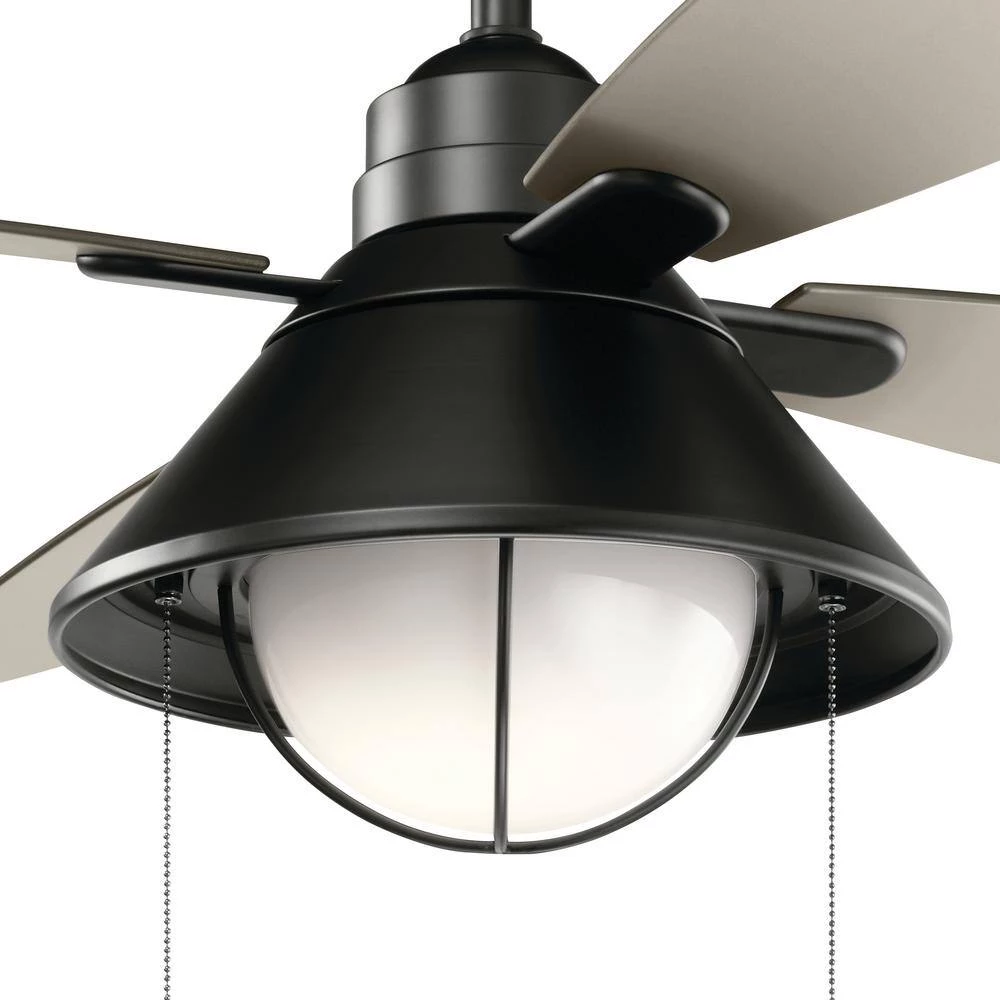 The KICHLER Seaside 54 in. Fan with satin black finish adds a vintage appeal to your living space. Its robust steel body is flanked by 4 ABS blades that enable efficient air circulation. This powerful ceiling fan also features an integrated LED bulb in a cased opal diffuser for even dispersion of warm white light. It is CSA/UL Listed for safe use in wet locations.