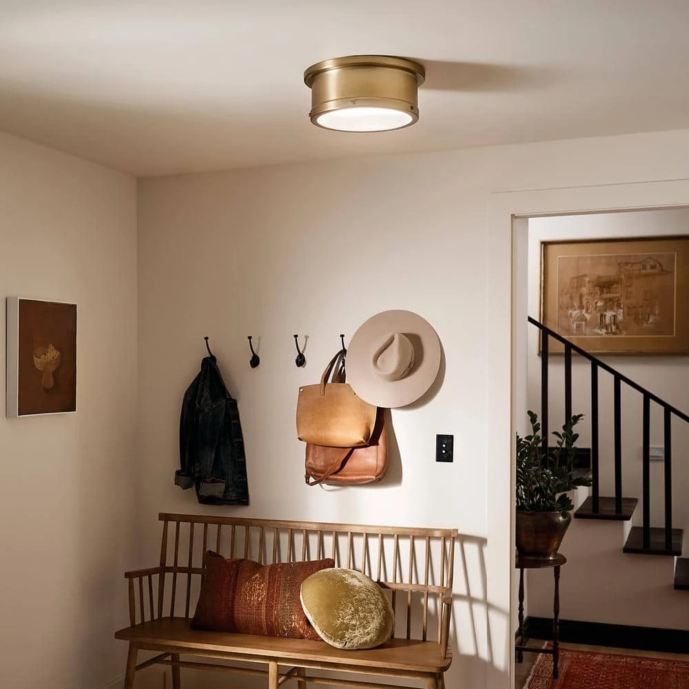 Simple yet strong, that’s the design of the Serca collection. Featuring a classic shape with elegantly refined details, Serca elevates your lighting and keeps it there. Upgrading the classic drum shape, Serca’s design was inspired by crown moulding from the Biltmore House. Finished in a refined brushed natural brass, this 14 in. flush mount’s sleek metal frame is subtle yet impactful. Small knobs around the bottom of the fixture’s frame allow for easy cleaning and bulb replacement.