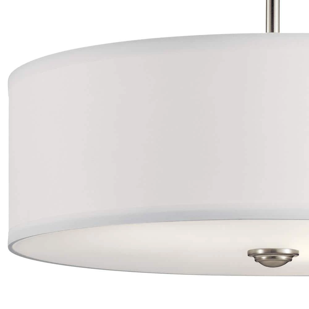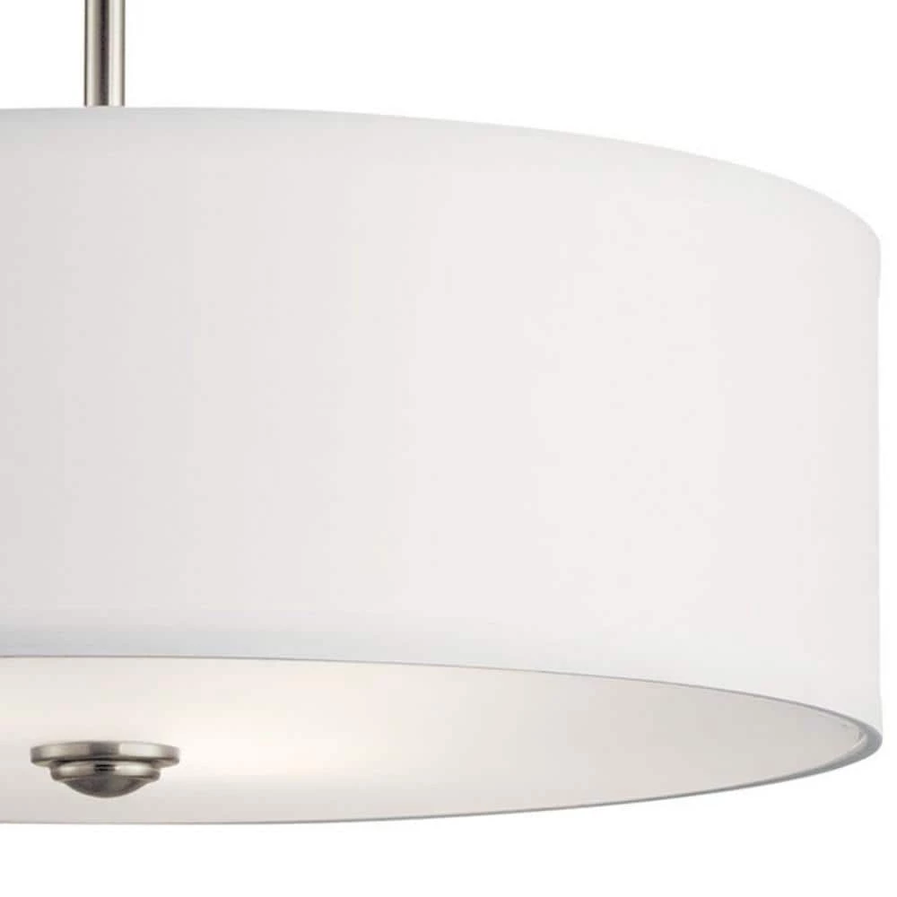 The KICHLER Shailene 18 in. 3-Light Brushed Nickel Round Semi-Flush Light features a classic look with clean lines. The white microfiber shade and satin etched diffuser lend a soft glow to your living room, bedroom and more. With its brushed nickel finish, this semi-flush light blends exceptionally well with most decor styles.