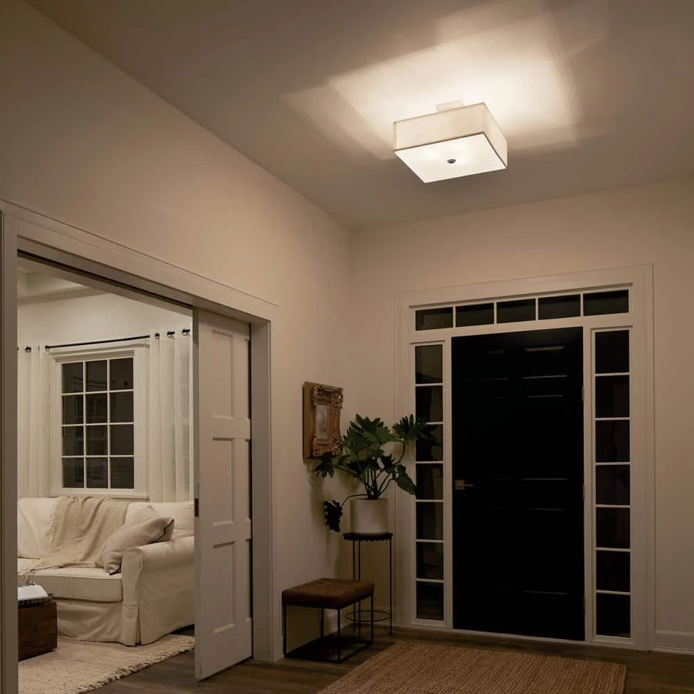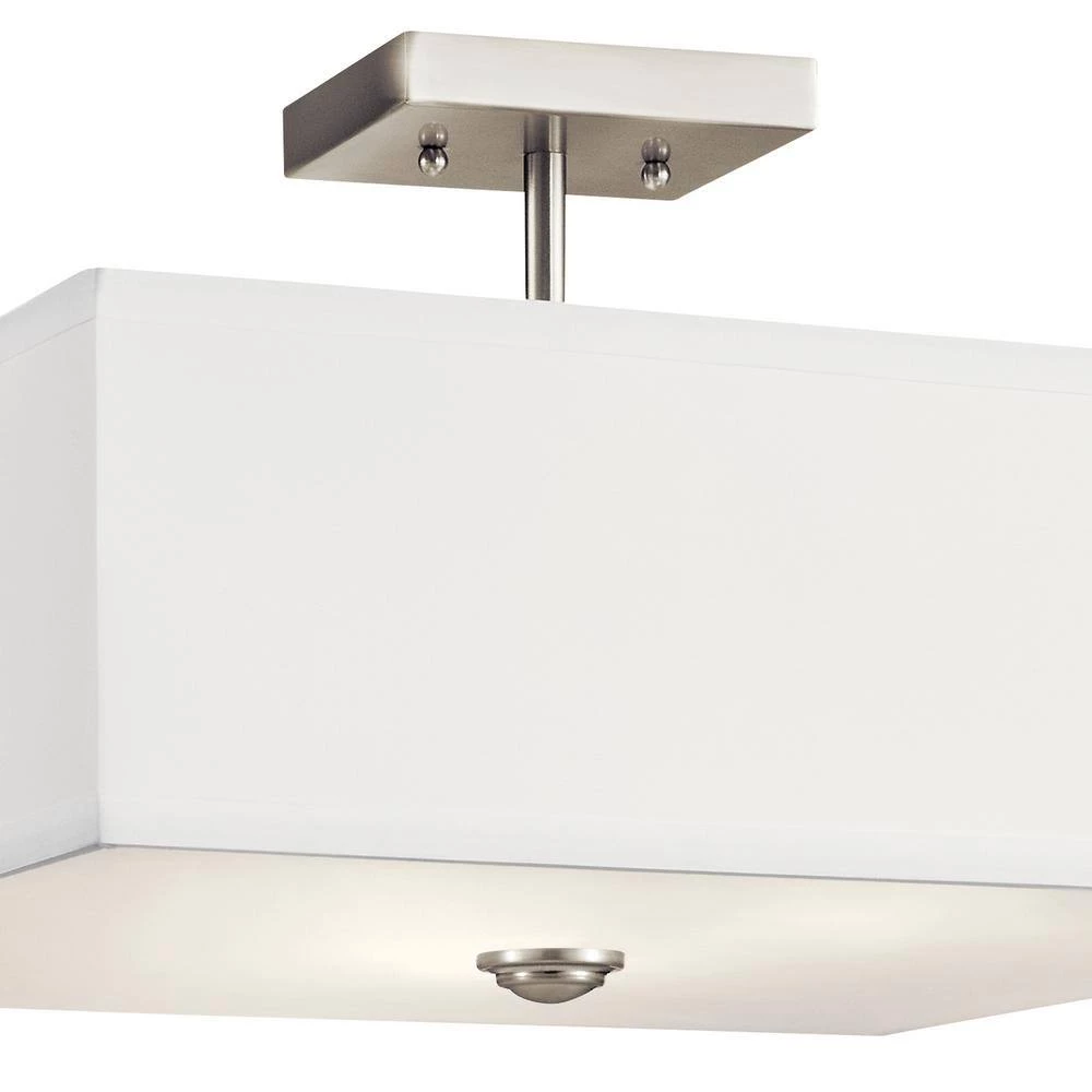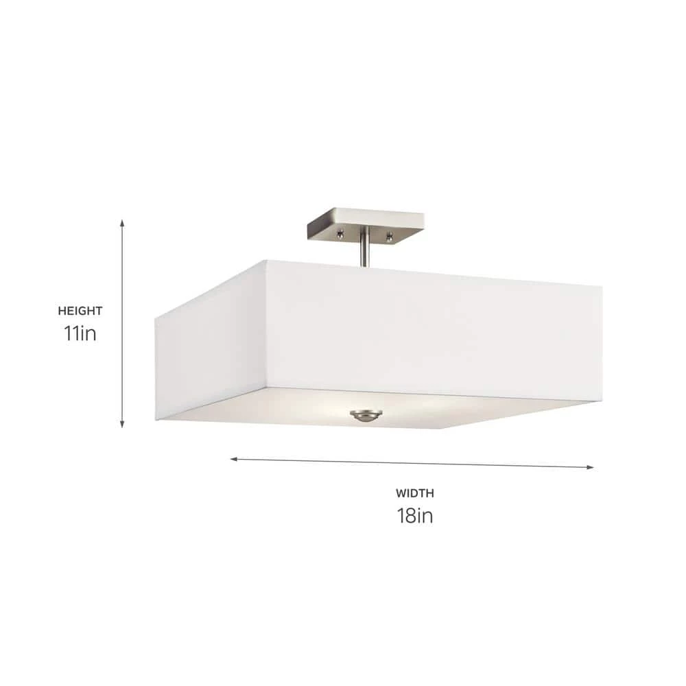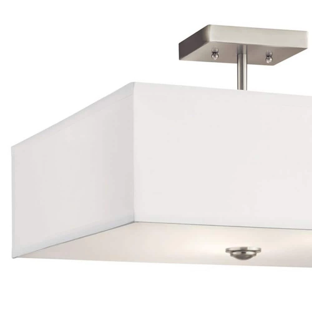 The KICHLER Shailene 18 in. 3-Light Brushed Nickel Square Semi-Flush Light features a classic look with clean lines. The white microfiber shade and satin etched diffuser lend a soft glow to your living room, bedroom and more. With its brushed nickel finish, this semi-flush light blends exceptionally well with most decor styles.