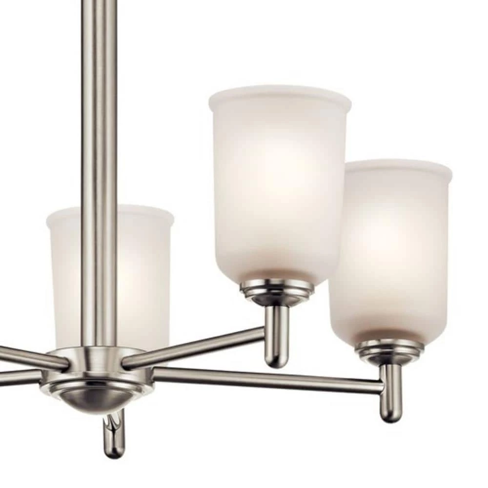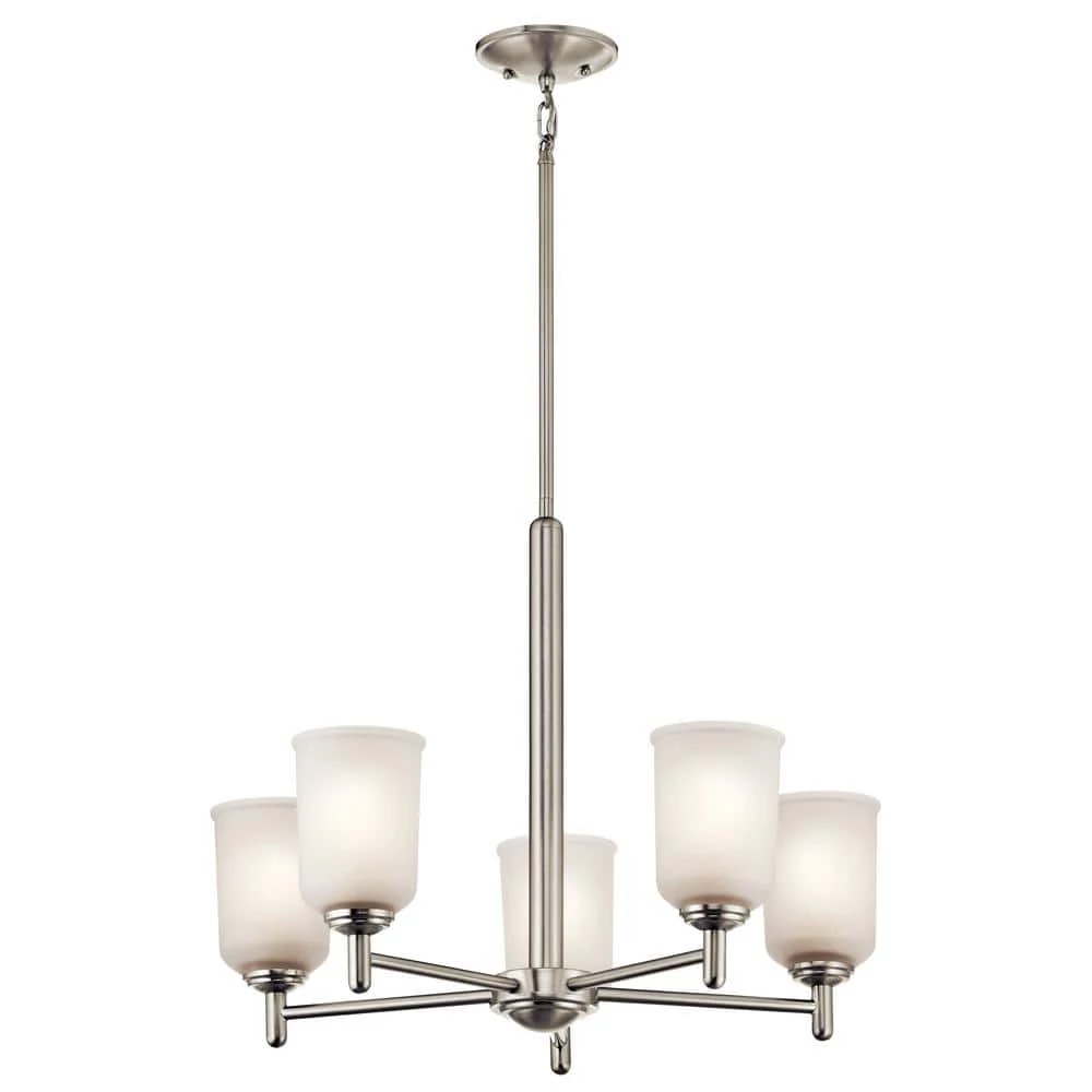 The Kichler Shailene 18.25 in. 5-Light Brushed Nickel Chandelier features a classic look with clean lines. Its up-sized satin etched glass shades ensure even diffusion of soft light throughout the room. With an attractive brushed nickel frame finish, this chandelier adds a touch of urban elegance to your home decor. It comes with a kit that enables secure, hassle-free installation on sloped ceilings.