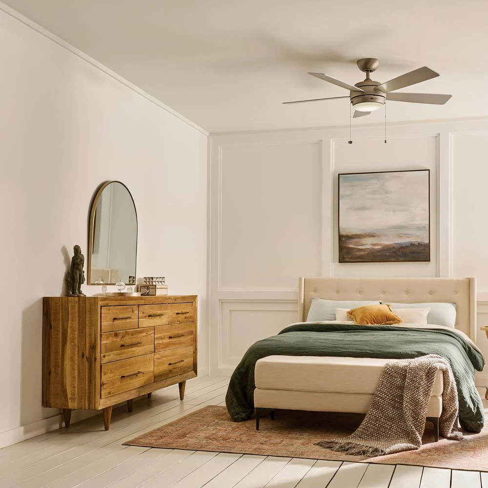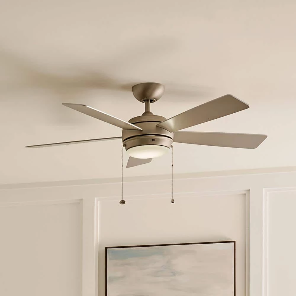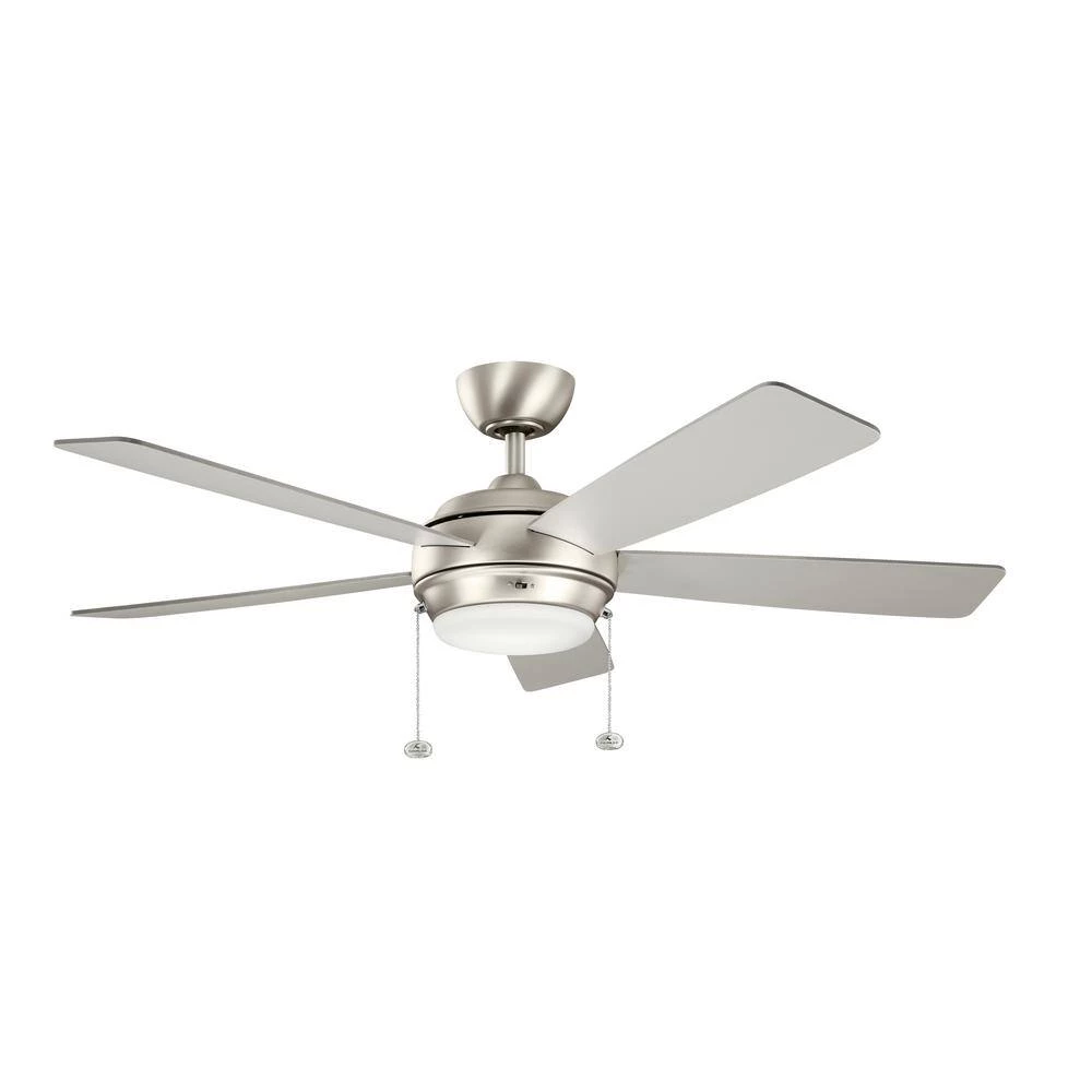Add a contemporary vibe to your space with the KICHLER Starkk LED 52 in. Brushed Nickel 5-Blade Fan with Reversible Silver and Walnut Blades. It features a transitional design that is sure to blend well with most types of decor. The LED bulb, encased in etched cased opal glass, provides a soft, warm glow to your space. It has 12° pitch blades that circulate air throughout the room. This fixture from KICHLER has two pull chains that allow for convenient operation of the fan. It is made of durable steel to ensure long-term use. This indoor fan is suitable for use in dry locations, making it an ideal addition to your dining room, living room, bedroom, and more.
