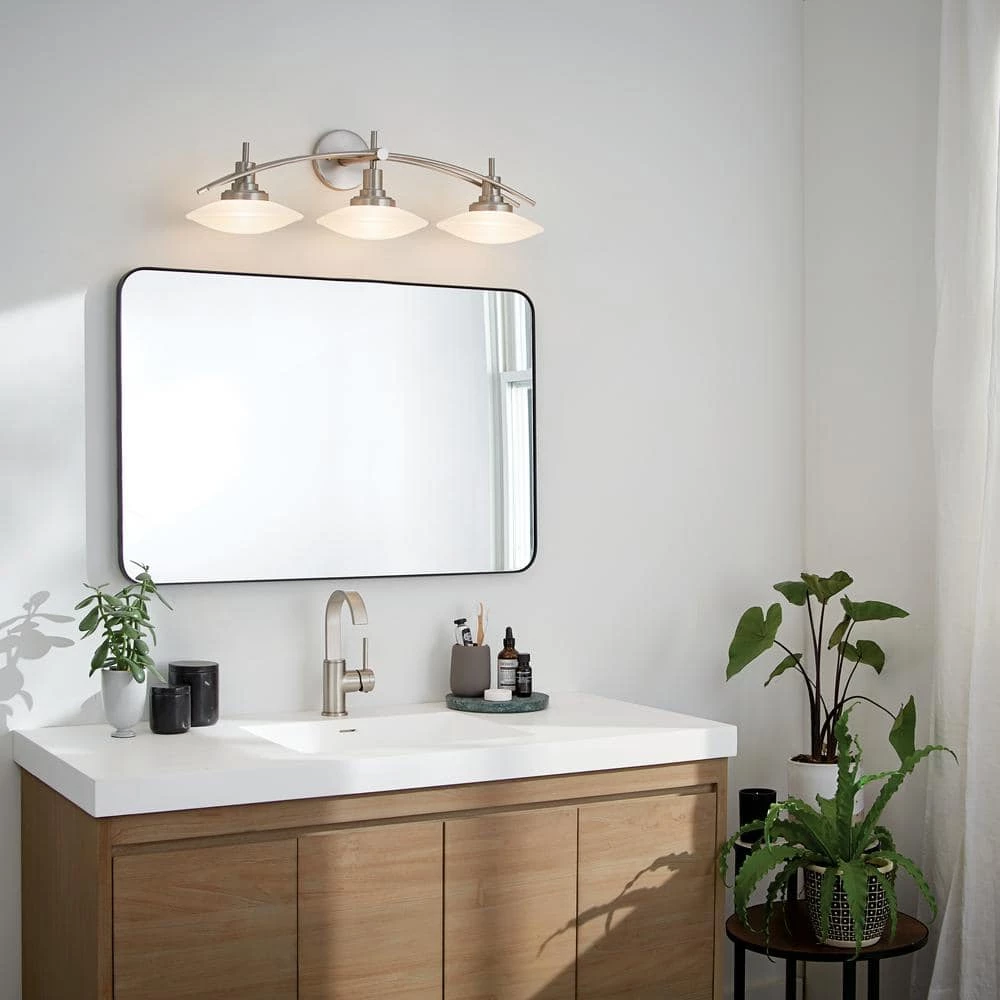 The KICHLER Structures 3-Light Brushed Nickel Vanity Light enhances the aesthetics of your bath vanity. The 3 satin etched white shades cast a soft, pleasing glow to create a perfect mood for your relaxation. The beautiful arched frame features a lustrous brushed nickel finish that completes the look.