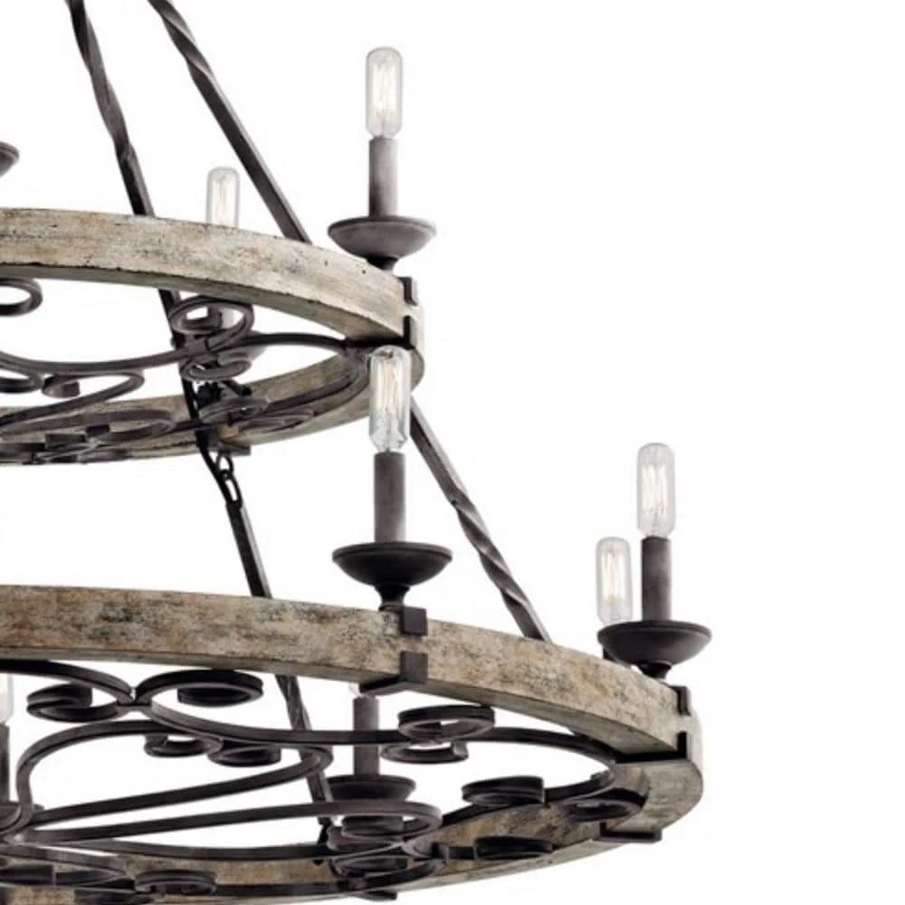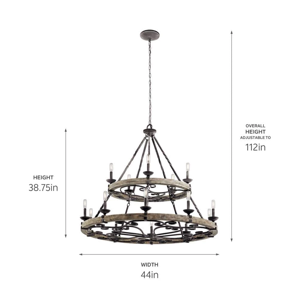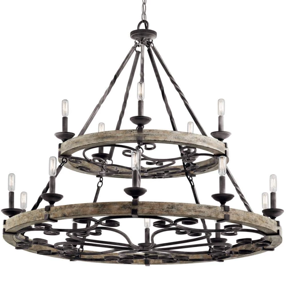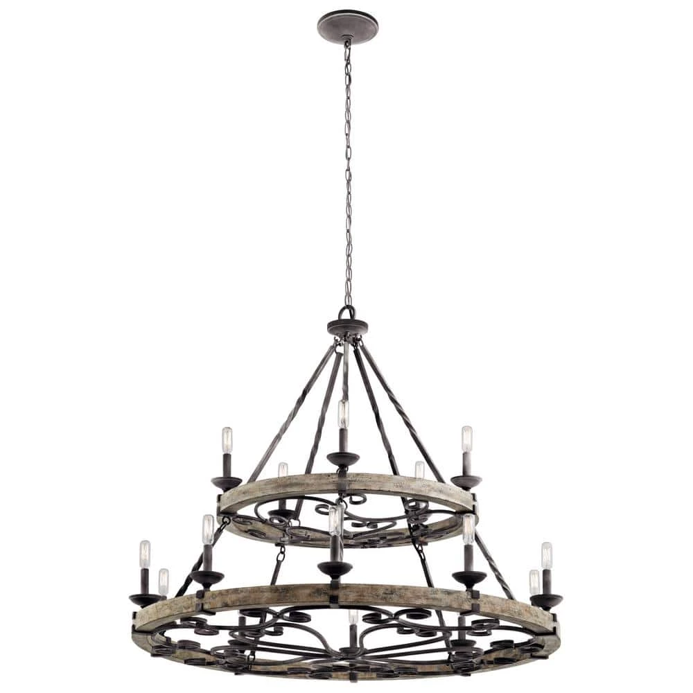The Kichler Taulbee 15-Light Weathered Zinc Chandelier is the perfect combination of style and functionality. It is designed to hold fifteen bulbs for optimum illumination. Its two-tier frame features gray wood veneer accents that offer an enhanced visual appeal. With a unique lodge-inspired design and weathered zinc finish, this chandelier adds rustic charm to various home decor styles.