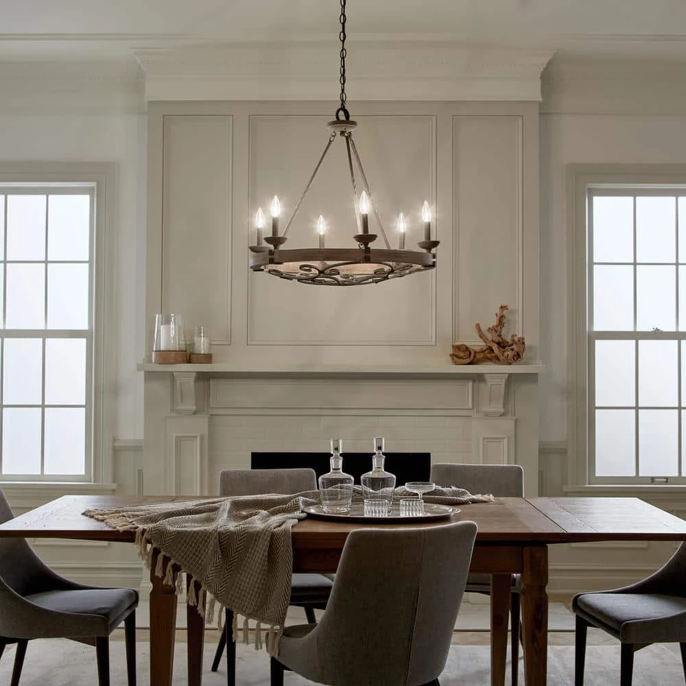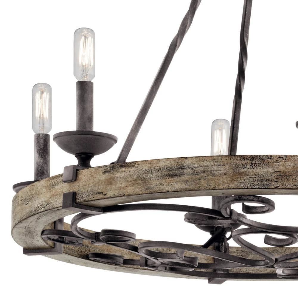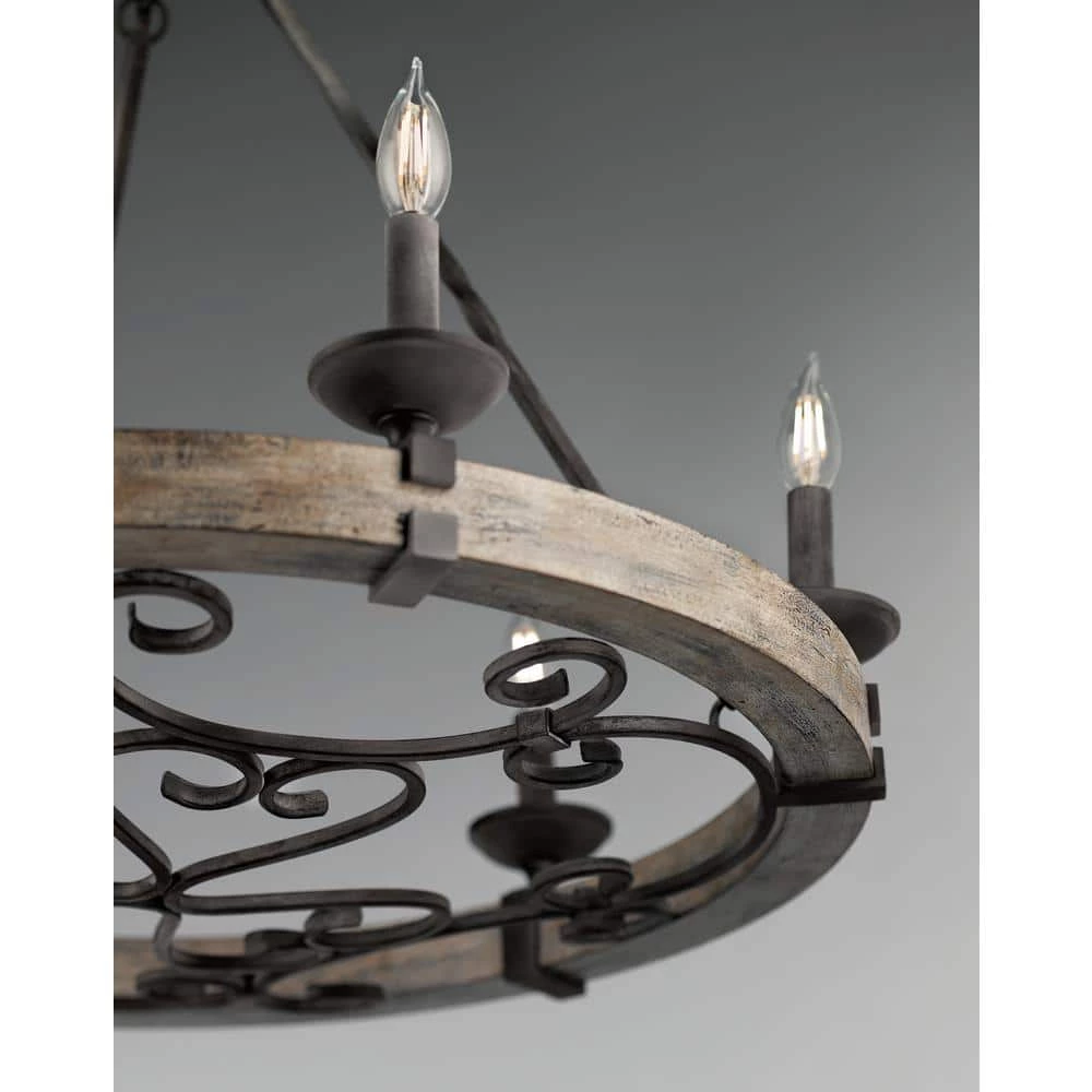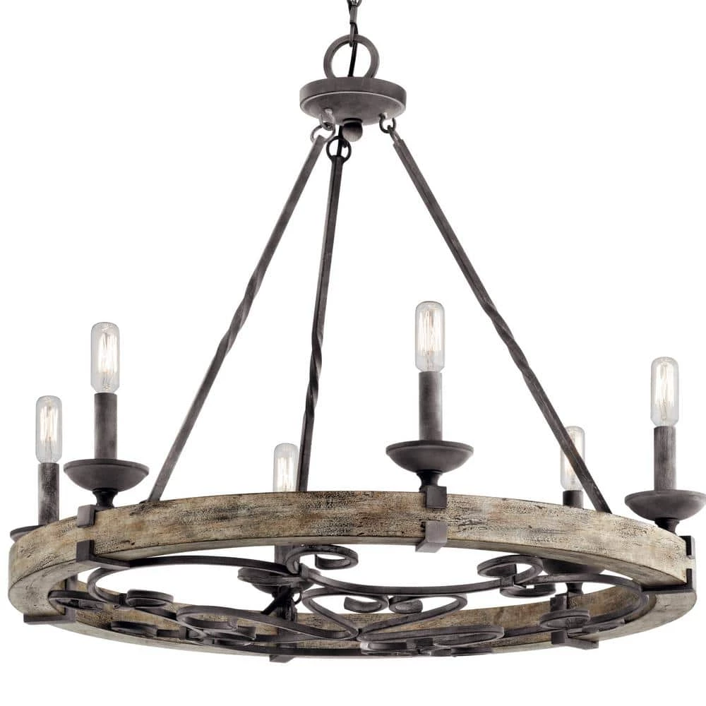 The Kichler Taulbee 6-Light Weathered Zinc Chandelier is the perfect combination of style and functionality. It is designed to hold six bulbs for optimum illumination. Its frame features gray wood veneer accents that offer an enhanced visual appeal. With a unique lodge-inspired design and weathered zinc finish, this chandelier adds rustic charm to various home decor styles.