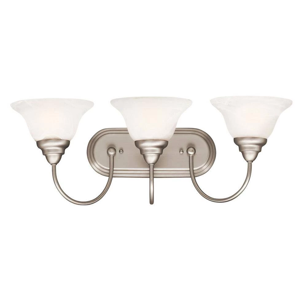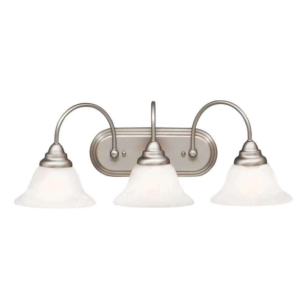 The KICHLER Telford 24.75 in. 3-Light Brushed Nickel Vanity Light with Alabaster Swirl Glass features an attractive design, making for a great addition to your bath space. The swirl glass shades provide a soft glow upon illumination. These shades can be installed either upwards or downwards according to your preference. This UL-listed vanity light is suitable for use in damp locations.