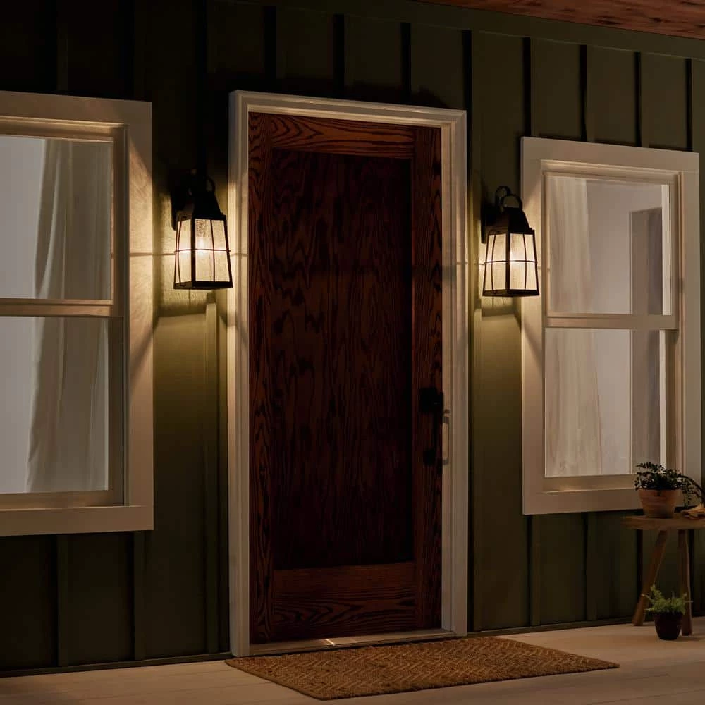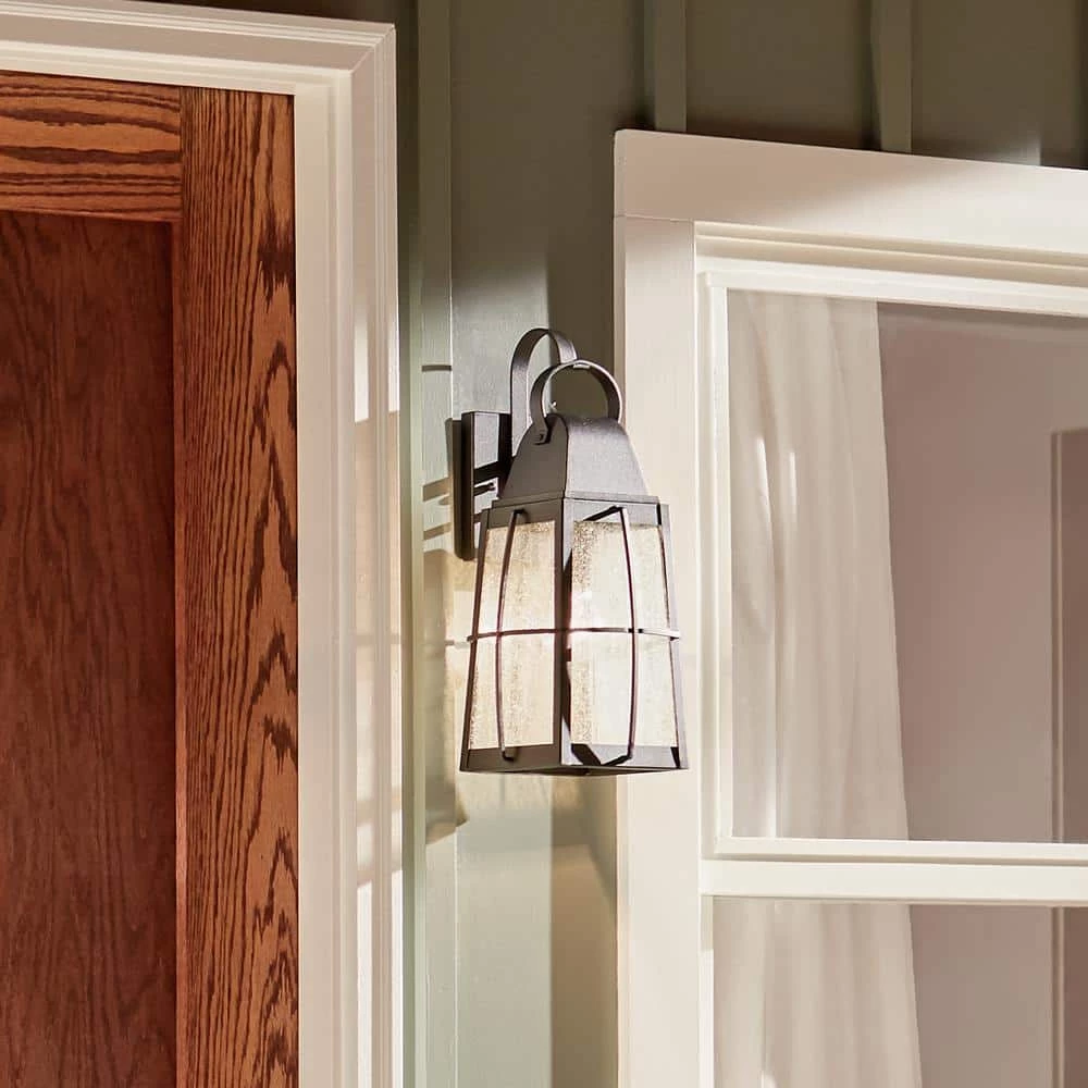 The Kichler Tolerand 17.75 in. 1-Light Textured Black Outdoor Wall Light features curved cage accents that enhance the visual appeal of any decor. Its clear seeded glass diffuser helps disperse light for optimum illumination. The durable aluminum construction of this wall light ensures-years of reliable use. It is an excellent lighting option to illuminate your entryway, garage door, patio, porch, and more.