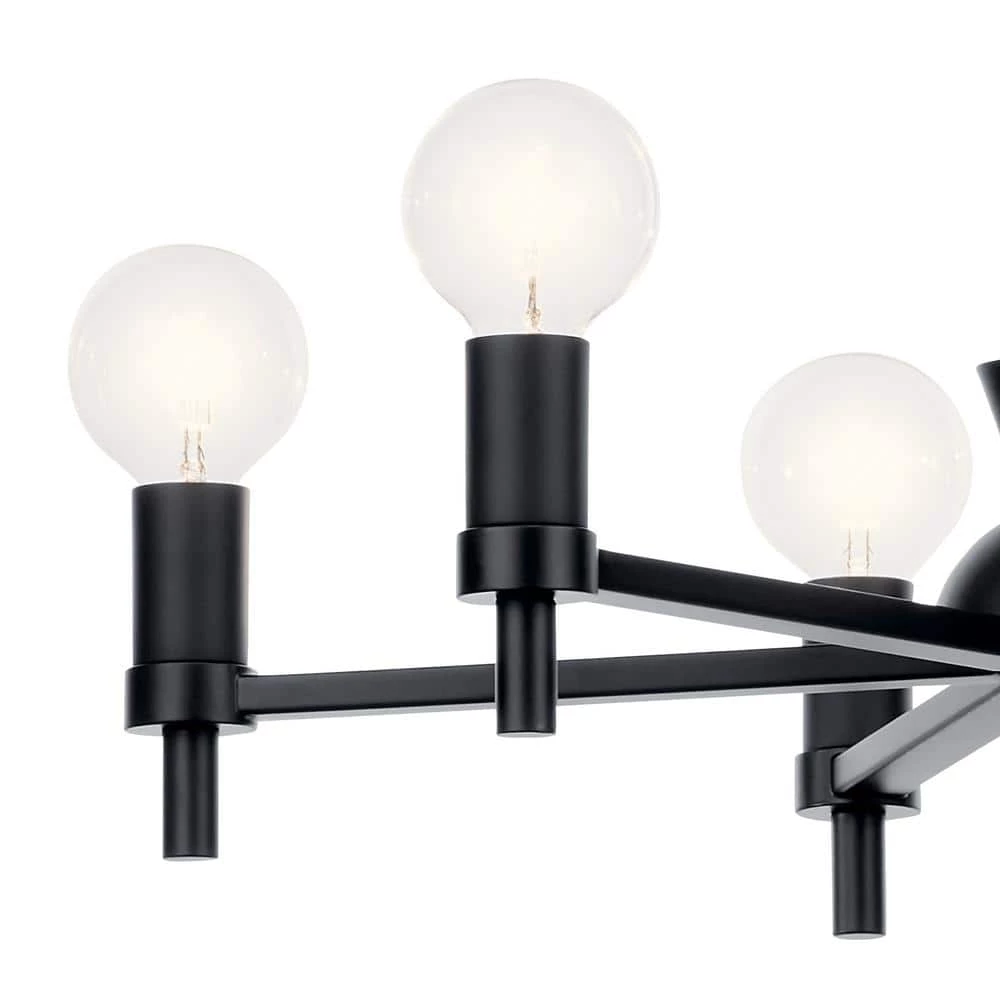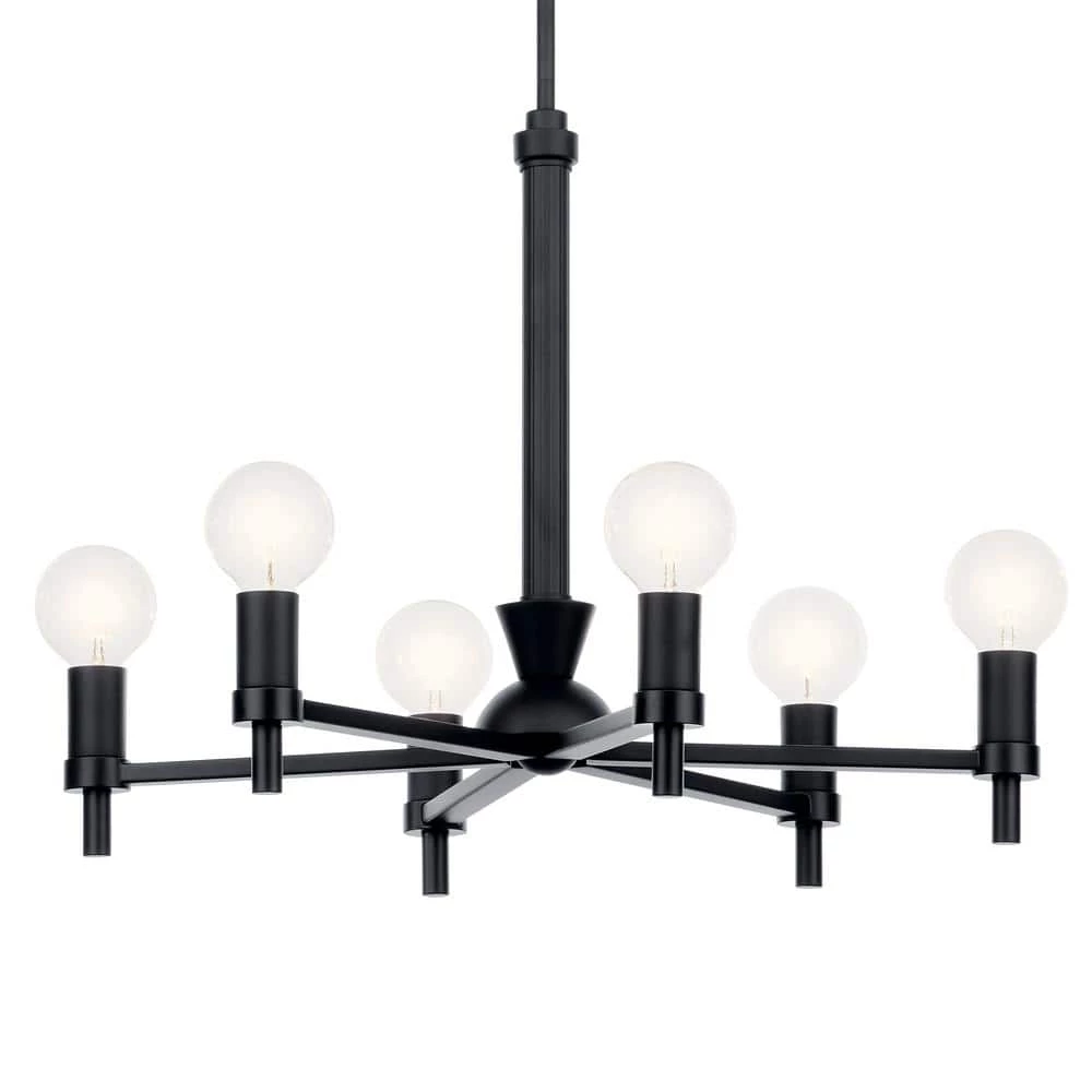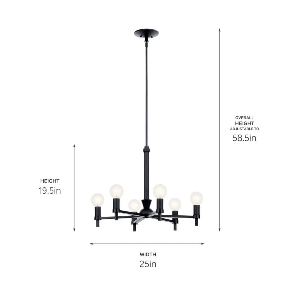 - The Torvee 25 inch 6 light chandelier features striking geometric shapes in Black to produce modern sophistication