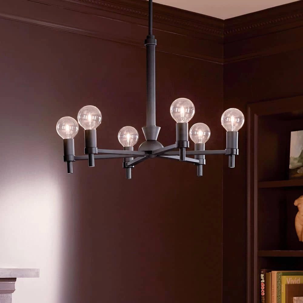 - What’s in the Box: (6) steel arms, (1) center stem, (6) candelabras, (1) coupling, (1) swivel, (1) inspection cable, (2) 12-inch stems, (2) 6-inch stems, (1) 6 inch round canopy, (1) mounting hardware, Bulbs not included
