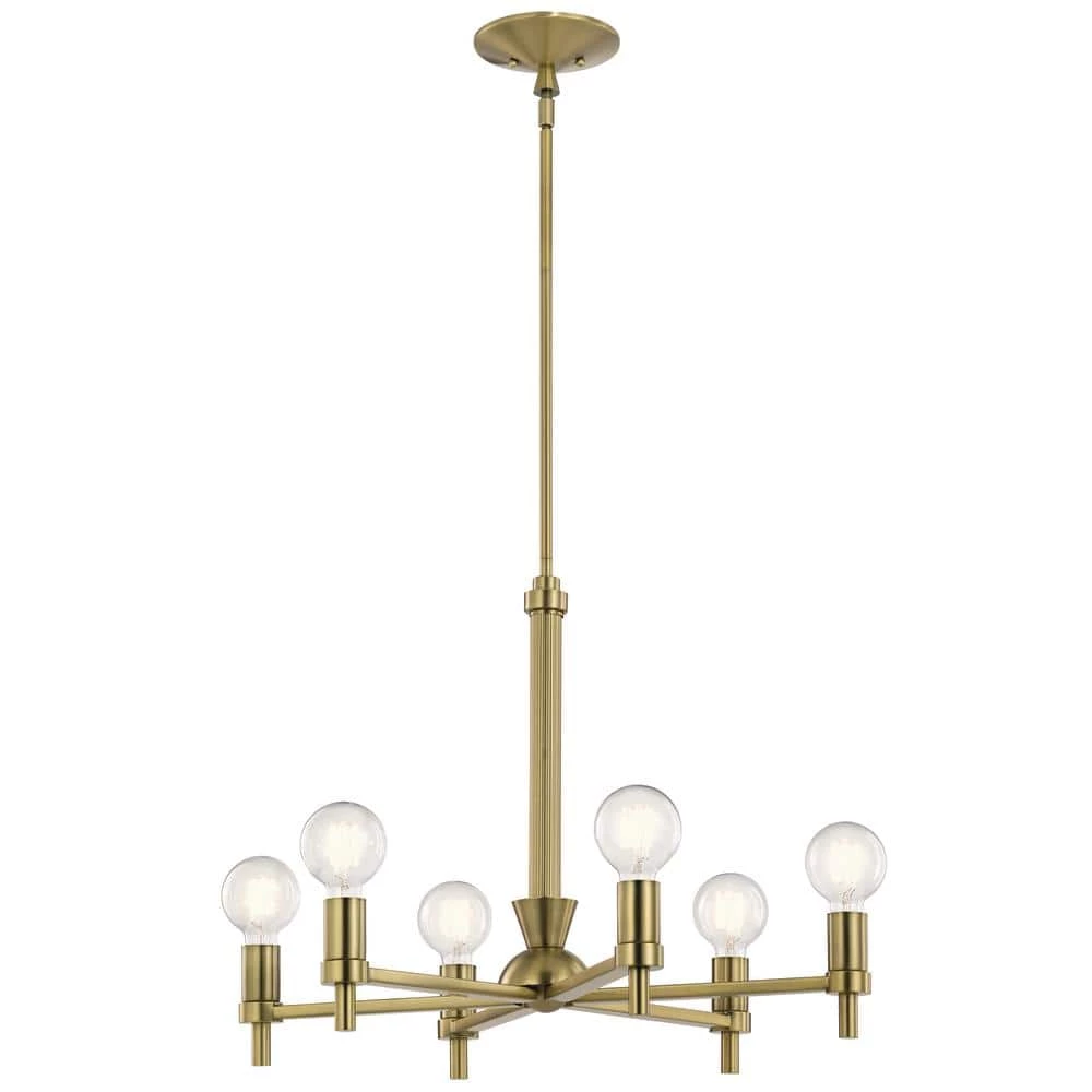 The Torvee collection is as playful as it is sophisticated. Leaving no detail untouched, this collection pulls geometric shapes from Art Deco and displays them in a clean, modern way. Rather than hide in the shadows, Torvee prefers to play in the light. The Torvee 26 in. 6-light chandelier invites you to gaze upon its striking geometric shapes. Its modern Brushed Natural Brass finish leaves the stodgy behind, as do the recommended light bulbs, because Torvee is sophistication at its most artsy.