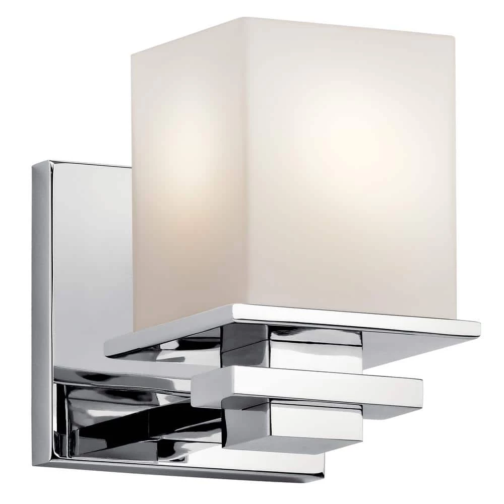 The KICHLER Tully 6.5 in. 1-Light Chrome Wall Sconce with Satin Etched Cased Opal Glass is a perfect combination of beauty and functionality. It features an angular geometric design for an attractive, contemporary look. This wall sconce can be installed facing up or down as per your requirements: turn the shade down to highlight a mirror or turn it up, towards the ceiling for a soft ambient light appeal. With its chrome finish, this wall sconce blends seamlessly well with almost any home decor, including traditional, soft contemporary and modern styles.